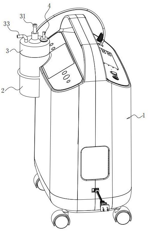 本申请涉及一种具有加湿功能的制氧机,涉及制氧设备的技术领域,其包括制氧机本体,用于制备氧气;储水筒,与制氧机本体连接,用于储存纯净水;密封盖,与储水筒连接,用于密封储水筒;进气管,连接于密封盖,用于连通制氧机本体与储水筒;连通管,一端与进气管连通,剩余一端插接于储水筒底端;出气管,连接于密封盖,且出气管与储水筒连通,用于排出加湿后的氧气;安全阀,与密封盖连接并与储水筒连通,用于调节储水筒内氧气压力,本申请具有提高使用者使用时的舒适性的效果。