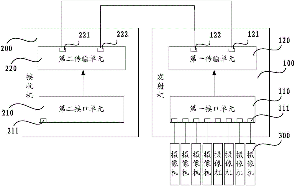 本实用新型公开了一种满载8个1080P网络摄像机的网络高清光端机。其包括发射机和接收机,发射机包括第一接口单元和第一传输单元;第一接口单元与第一传输单元电连接,向第一传输单元传送信号;第一接口单元设置有连接摄像机的第一连接端口;第一传输单元设置有第一光接口和第一电接口;接收机包括第二接口单元和第二传输单元;第二传输单元与第二接口单元电连接,向第二接口单元传送信号;第二传输单元设置有第二光接口和第二电接口;第二光接口与第一光接口通过光纤连接,和/或第二电接口与第一电接口电连接,用于在发射机和接收机之间传送信号;第二接口单元设置有与以太网连接的第二连接端口,用于传送信号。其使视频数据传输的线路选择更灵活。