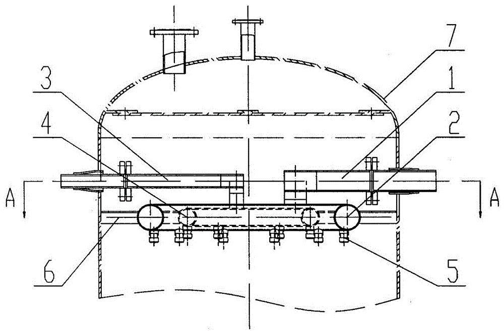 本实用新型涉及一种除氧器喷淋装置,其特征在于:由进水管Ⅰ、圆环管Ⅰ、进水管Ⅱ、圆环管Ⅱ、喷嘴和支撑装置组成;进水管Ⅰ的一端呈弯头形状设置在圆环形状的圆环管Ⅰ的上面,在圆环管Ⅰ的下面设有均匀排布的孔与喷嘴连接;进水管Ⅱ的一端呈弯头形状设置在圆环形状的圆环管Ⅱ的上面,在圆环管Ⅱ的下面设有均匀排布的孔与喷嘴连接;圆环管Ⅰ与圆环管Ⅱ处于同一平面,圆环管Ⅱ布置在圆环管Ⅰ的环孔内通过支撑装置固定连接组成除氧器喷淋装置设置在除氧头的上部。本实用新型克服了在除氧器低负荷运行时喷淋不均匀、喷洒面积减小、除氧效果不好等问题,实现分级调节,在30~110%额定负荷运行时均能实现含氧量≤0.1mg/l的除氧效果。