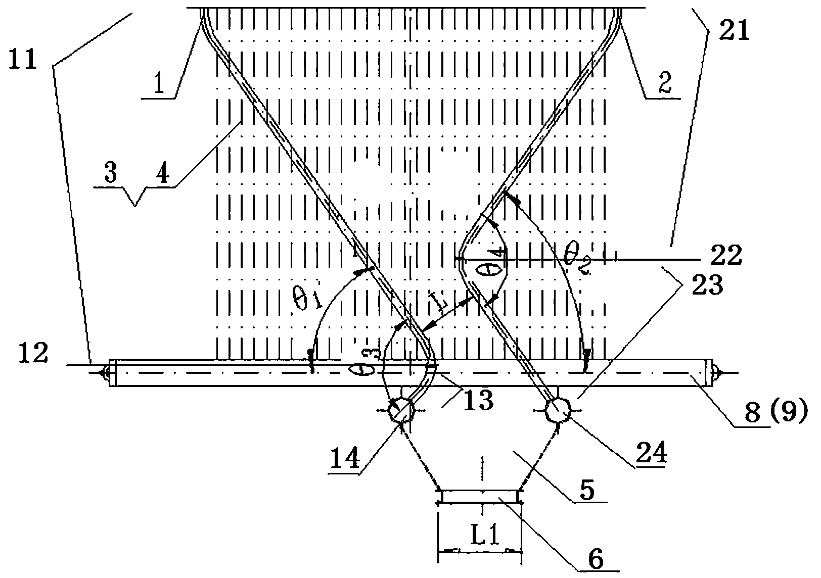 本实用新型涉及锅炉灰斗制造技术领域,尤其涉及一种防高温辐射及防焦块冲击的水冷灰斗,包括水冷壁前墙、水冷壁后墙、水冷壁左锥底和水冷壁右锥底,其特征在于,所述水冷壁前墙、水冷壁后墙上的水冷壁管均为垂直排布形式,所述水冷壁左锥底和水冷壁右锥底上的水冷壁管均包括锥段、拐点、滑道段;所述左锥段和右滑道之间形成宽500mm≤L≤600mm的通道。与现有技术相比,本实用新型的有益效果是:1)水冷壁结构直接避免了炉膛内高温烟气对除渣机的直接辐射,显著提升了除渣机的机械性能。2)弯曲水冷壁作为大型焦块下落后的直接受力对象,弱化了大型焦块对下部除渣机的冲击力,明显地延长了除渣机的使用寿命。