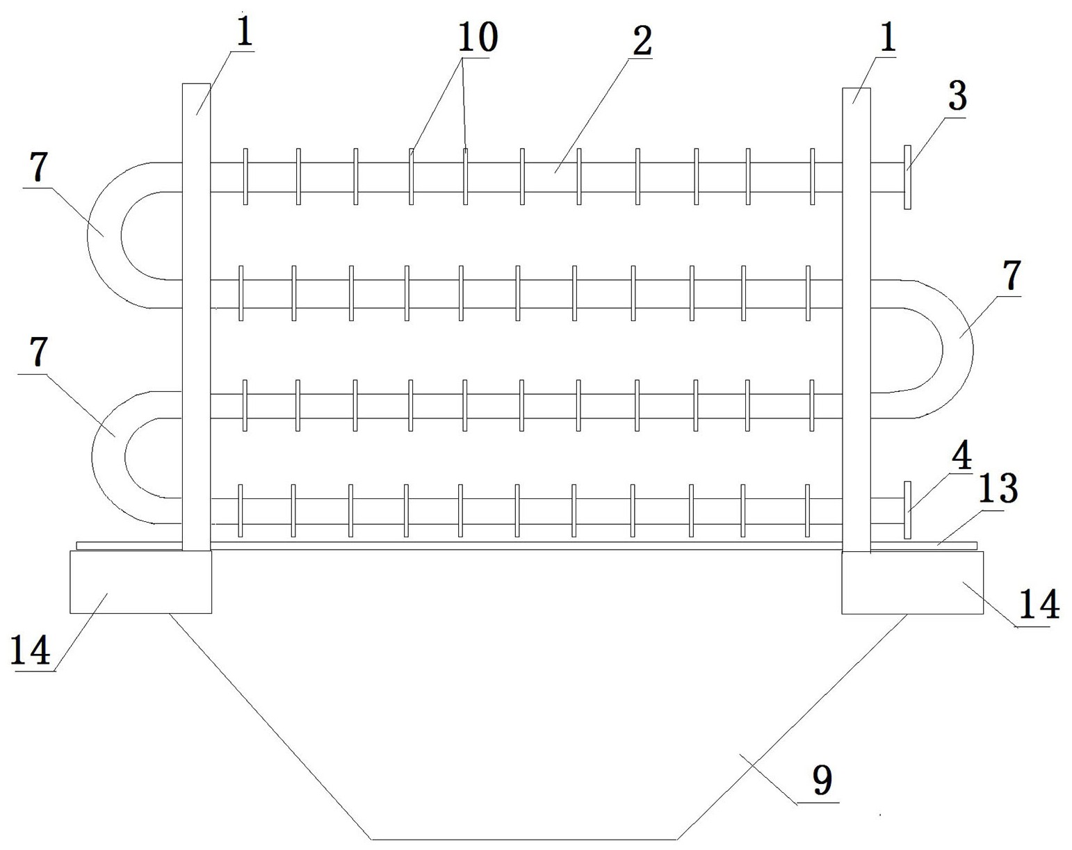 本实用新型涉及工业锅炉制造技术领域,尤其涉及一种锅炉省煤器,包括管架、蛇形管,多个蛇形管阵列排布在管架上,进水口和出水口分别设于蛇形管的两端,其特征是,所述蛇形管沿垂直方向盘绕,蛇形管内设有金属纤维束,所述纤维束两端分别连接垫圈,所述垫圈分别与进水口和出水口的法兰配套连接,所述金属纤维束总截面占所在蛇形管内截面的20~60%。所述金属纤维为不锈钢金属纤维、黄铜纤维或铸铁纤维中的任一种。与现有技术相比,本实用新型的优点是:1)增加了装置外壳与水介质的热传导作用,直接传导和间接传导效率均显著提高;2)金属纤维采用组合结构,适用于周期性的除垢维护;3)该结构延缓了灰堵的发生,提高了装置的使用寿命。
