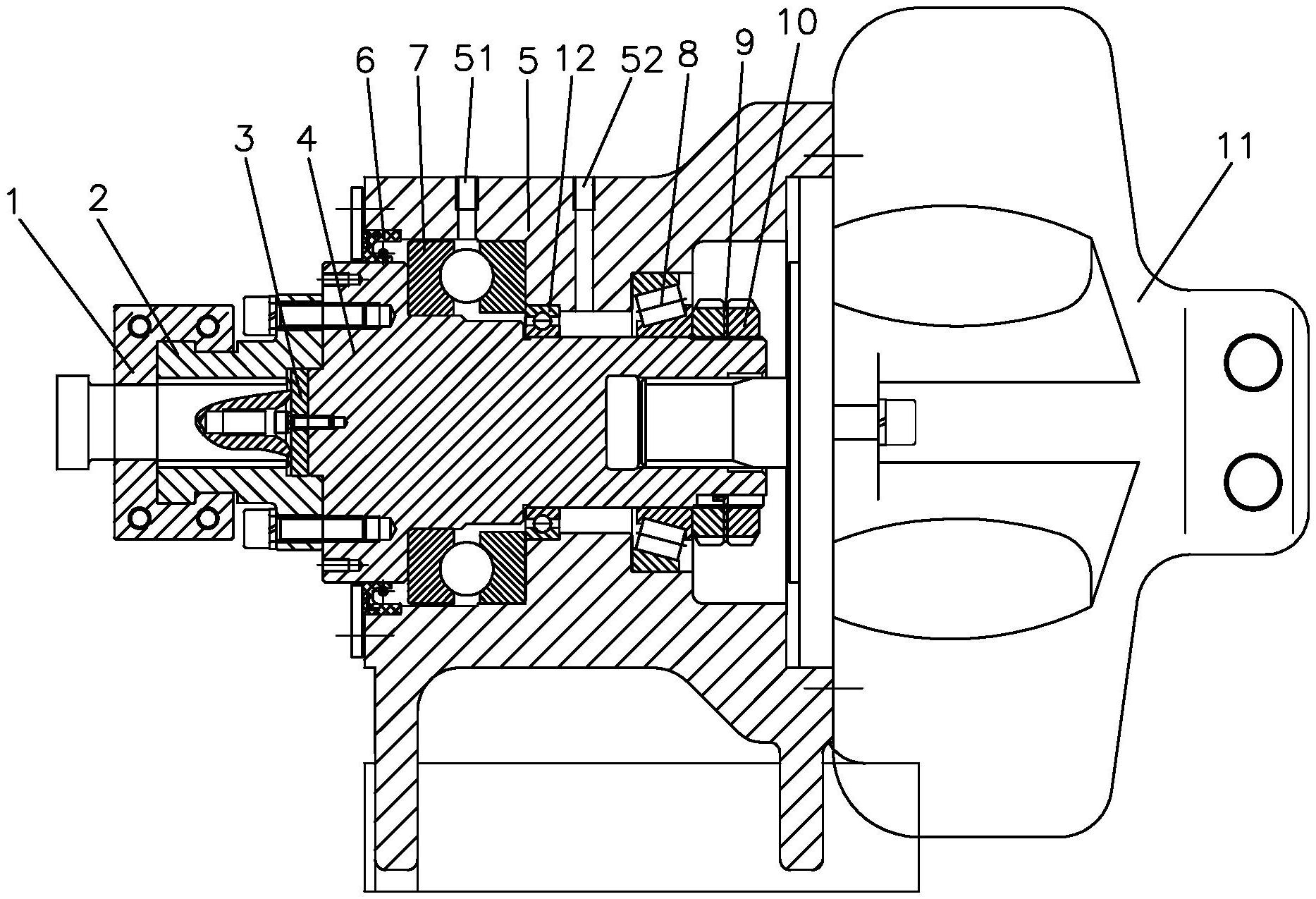 本实用新型涉及一种注塑机顶轴的定位安装结构,包括顶轴、推力座、深沟球轴承、推力球轴承和圆锥滚子轴承;推力球轴承、深沟球轴承和圆锥滚子轴承之间从左至右安装在顶轴上,并且推力球轴承、深沟球轴承和圆锥滚子轴承配合安装在推力座中;顶轴的右端和油马达连接,该油马达安装在推力座的右端;推力座的左端安装有油封,该油封套装在顶轴上。本申请中顶轴的定位安装结构系统稳定性好,深沟球轴承降低顶轴在旋转过程中发生径向位移跳动的风险。