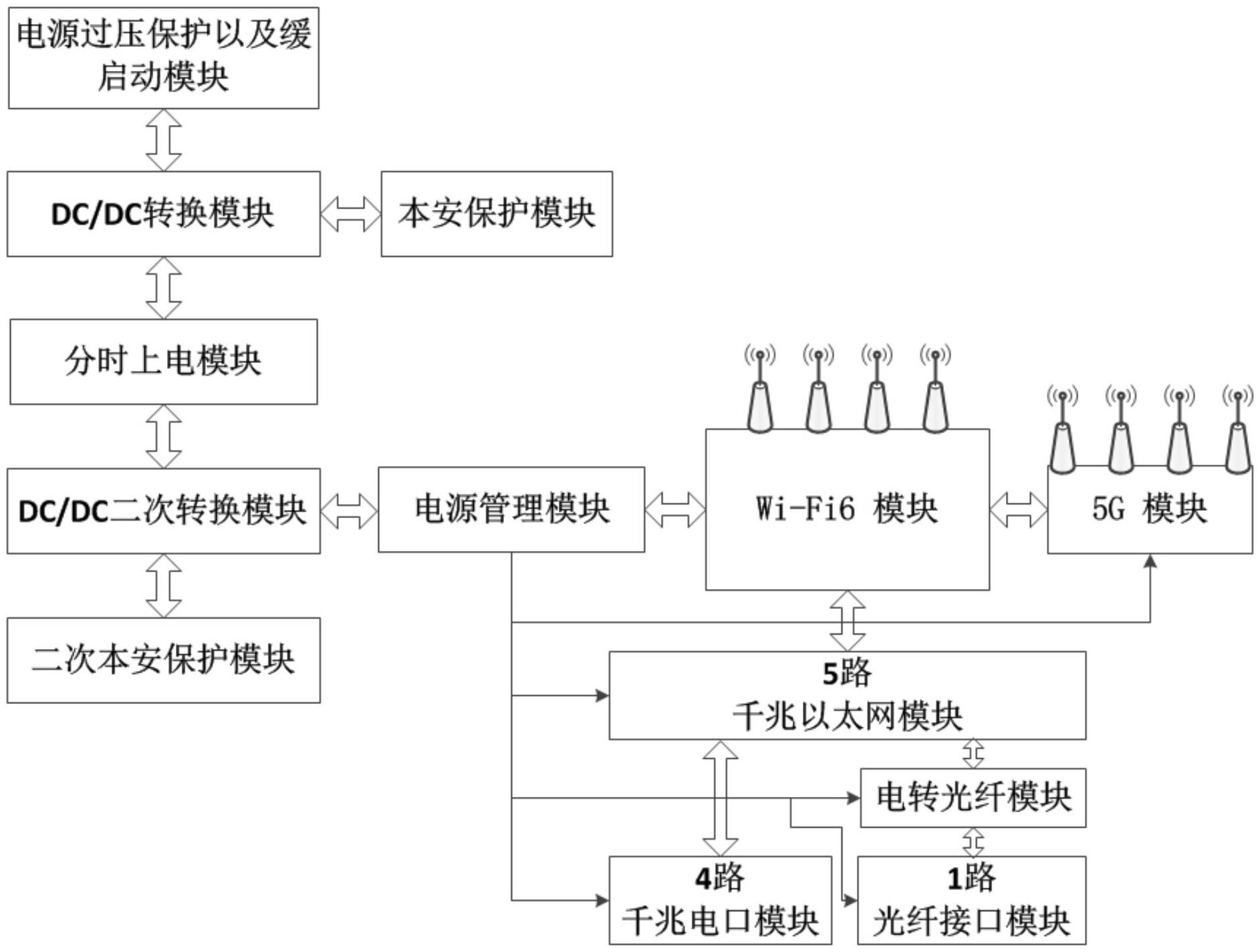 本实用新型提出了一种本安型Wi‑Fi6千兆光纤5G路由器,所述本安型Wi‑Fi6千兆光纤5G路由器包括:电源过压保护以及缓启动模块、DC/DC转换模块、本安保护模块、分时上电模块、DC/DC二次转换模块、电源管理模块、Wi‑Fi6模块、5G模块、5路千兆以太网模块、电转光纤模块、4路千兆电口模块、1路光纤接口模块;支持Wi‑Fi6传输方式,无线速率将近3000Mbps;其中2.4G的理论传输速率为574Mbps,5.8G的理论传输速率为2402Mbps;同时支持千兆光纤上行和5G蜂窝网络上行通信;5G满足高带宽低时延的要求,理论带宽不低于20Gb/s,理论时延的最低1ms,可完全满足现代化井下通信的需求,比如无人驾驶的矿车、采煤机等各种装备。