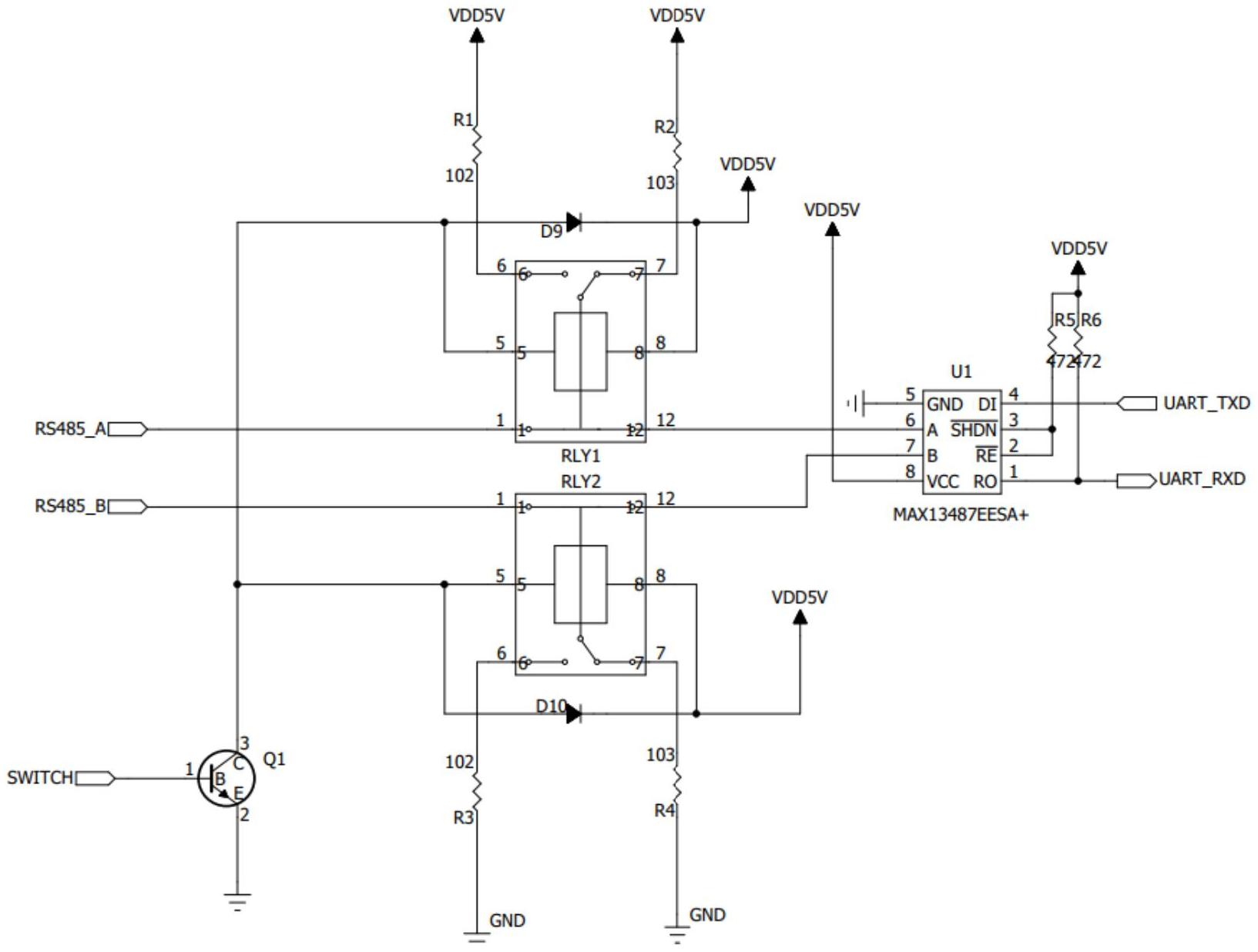本实用新型提供一种RS485模块的通信电路,RS485模块的通信电路包括RS485模块和信号转换器,RS485模块和信号转换器之间连接有第一数据总线(A)和第二数据总线(B),其中,第一数据总线(A)通过第一切换模块连接有上拉电阻,第二数据总线(B)通过第二切换模块连接有下拉电阻,且上拉电阻和下拉电阻均至少包括两个不同的阻值的电阻单元;本实用新型的RS485总线连接的上/下拉电阻可通过切换模块实现连接不同阻值的电阻,不需要手动更换上/下拉电阻,其会根据RS485总线使用场景自动切换上/下拉电阻,保证总线通信正常,减少了手动更换电阻的人力成本以及时间成本。