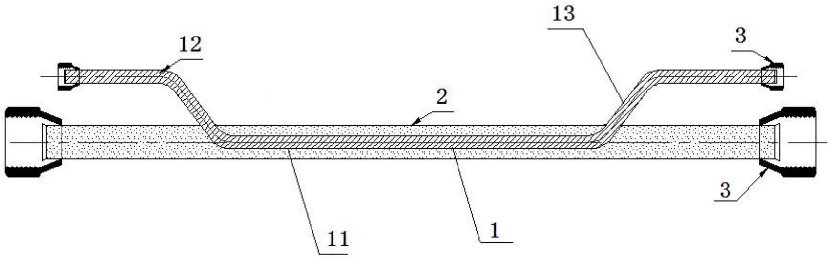 本实用新型涉及空调技术领域,具体为一种空调用联机套管及其单冷分体式空调,所述联机套管包括液管联机管和气管联机管,所述液管联机管包括第一管段,所述第一管段设置在气管联机管内部;所述空调室外机包括压缩机、室外热交换器,室内机包括节流机构、室内热交换器,室外热交换器、节流机构分别通过管路与液管联机管连通,室内热交换器、压缩机分别通过管路与气管联机管连通,空调制冷运行时,从室内热交换器进入气管联机管的气态冷媒与从室外热交换器进入第一管段的液态冷媒换热后流入压缩机。应用本实用新型的联机套管后,进入室内机节流机构的冷媒相较于无联机套管的冷媒,温度更低、过冷度更大,显著提高空调的制冷能力。