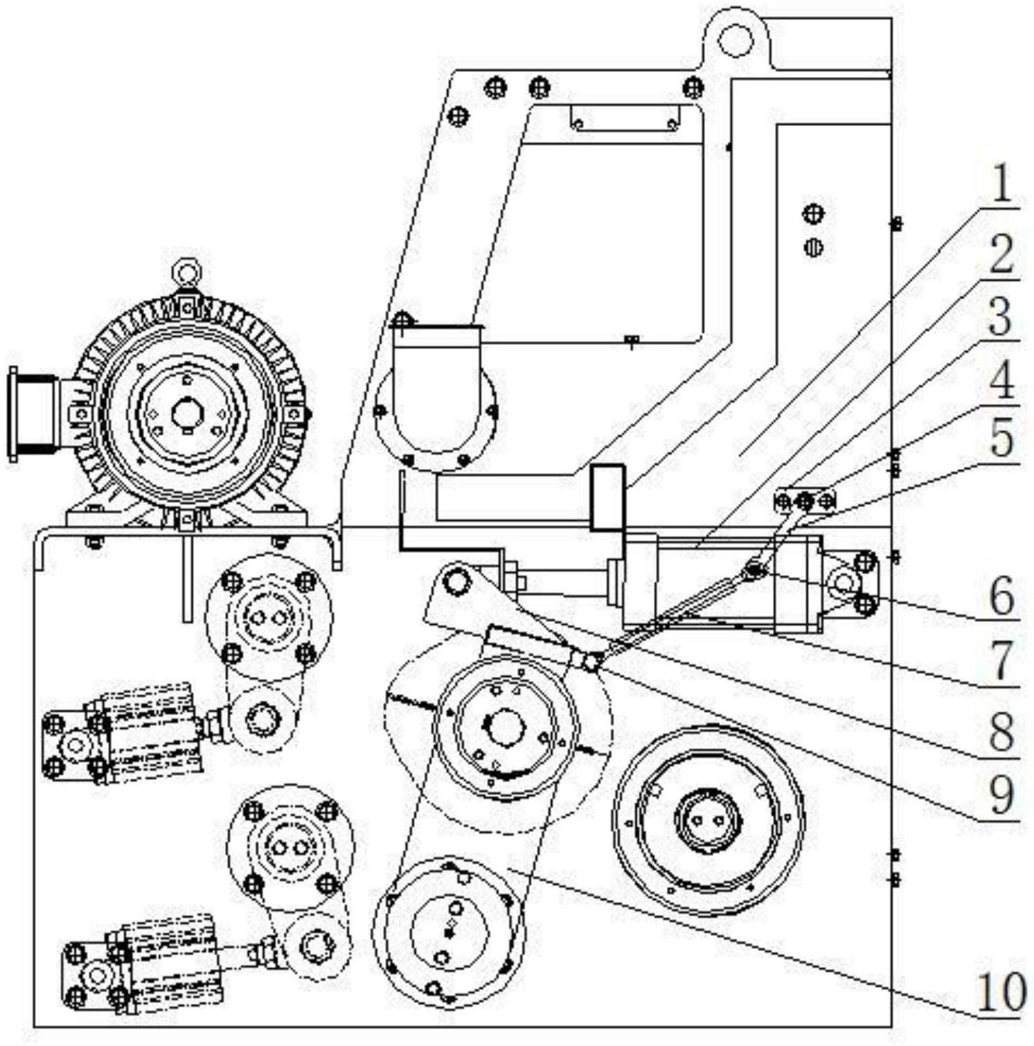 本实用新型公开了一种气动砻谷机的下料淌板跟踪机构,包括调节组件、连杆组件、若干拉簧装置和若干跟踪轮组件,所述调节组件包括气缸、气缸耳座,所述气缸设置在气动砻谷机的箱体侧板外,其动力端连接到气缸耳座,气缸耳座连接到气动砻谷机的移动辊轴座,所述连杆组件一端固定在箱体侧板上,另一端与气缸耳座连接。保证下料淌板的受力一致性,通过装在外部的移动轴座上的气缸耳座直接将连杆组件连接极大的方便了调节下料淌板的跟踪工作。
