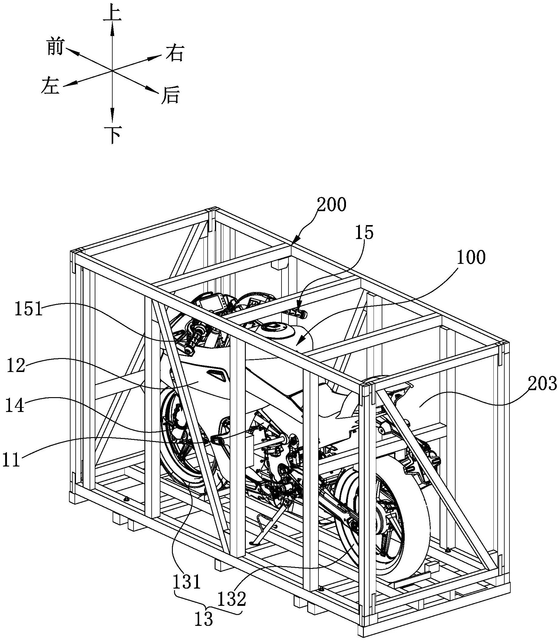 本实用新型公开了一种两轮车的固定装置,该固定装置包括第一支架组件、第二支架组件和第三支架组件,第三支架组件设置在第一支架组件和第二支架组件之间。两轮车包括车架。第三支架组件包括第一竖杆和第二竖杆,第三支架组件设置有固定机构,固定机构设置在第一竖杆和第二竖杆之间。当车架和固定机构处于装配状态时,固定机构的一端连接车架,固定机构的另一端连接第一竖杆和/或第二竖杆,固定机构能够在车架与第三支架组件之间形成有支撑力。通过上述设置,可以在两轮车宽度方向对两轮车进行刚性支撑,从而提高固定装置的保护作用。