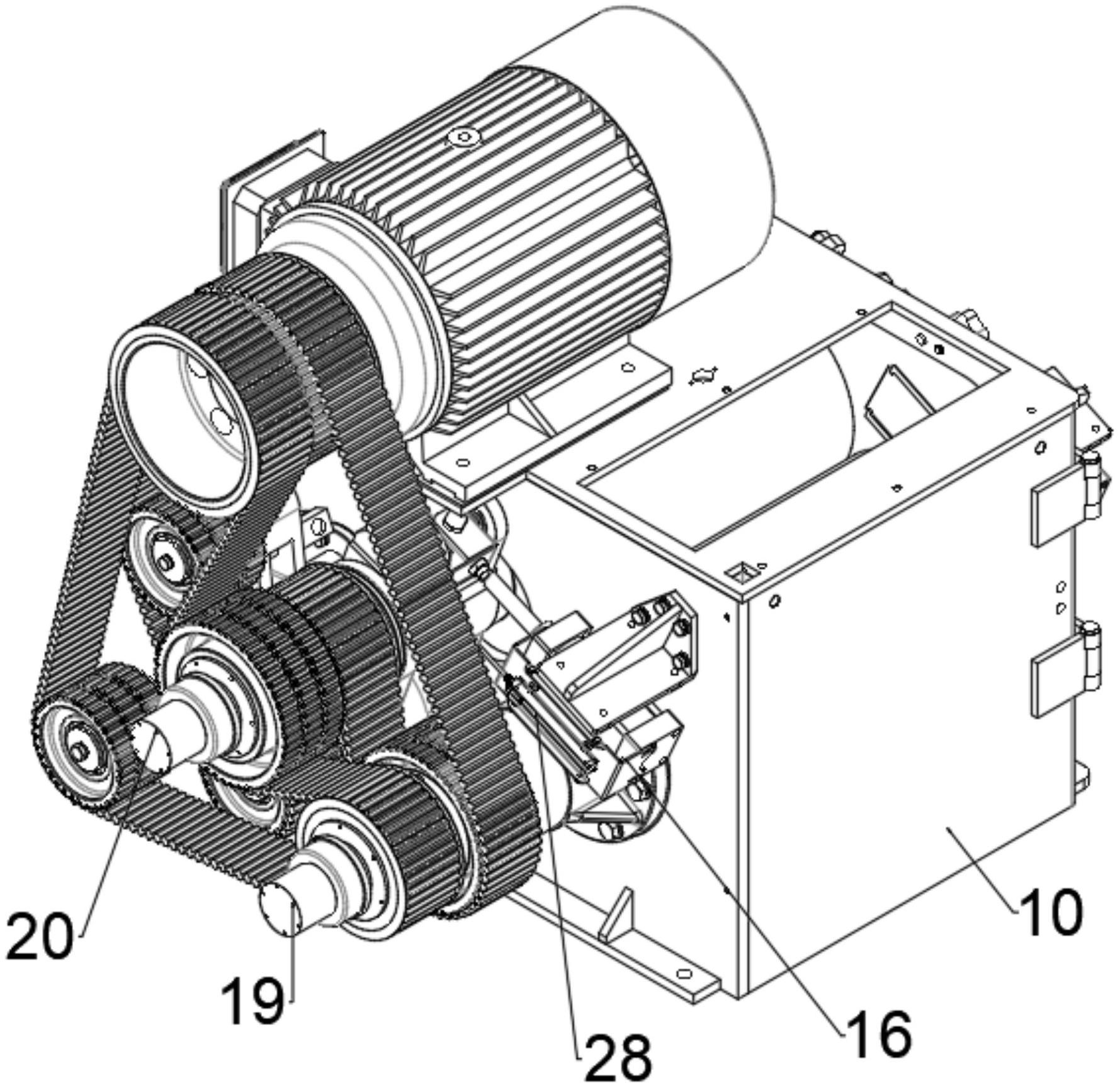 本实用新型涉及砻谷机技术领域,公开了一种实时监控砻谷部胶辊磨损装置,本实用新型包括机壳、第二胶辊转轴、第一胶辊转轴、第一胶辊、第二胶辊,所述第一胶辊转轴的两端滑动插装于所述活动轴行程孔内,所述机壳的外壁铰接设有调节所述第一胶辊转轴轴心位置的调节机构,所述调节机构上与其平行设有测距机构,所述机壳内固定设有测量所述第二胶辊的测距装置。本实用新型通过随第一液压杆实时调整的伸缩电子尺可获得两个胶辊的中心距调整量,获得了两个胶辊的总变化量,通过红外测距仪测量第二胶辊的单侧损耗然后将总损耗减去第二胶辊的单侧损耗即可得到两个胶辊的准确损耗。