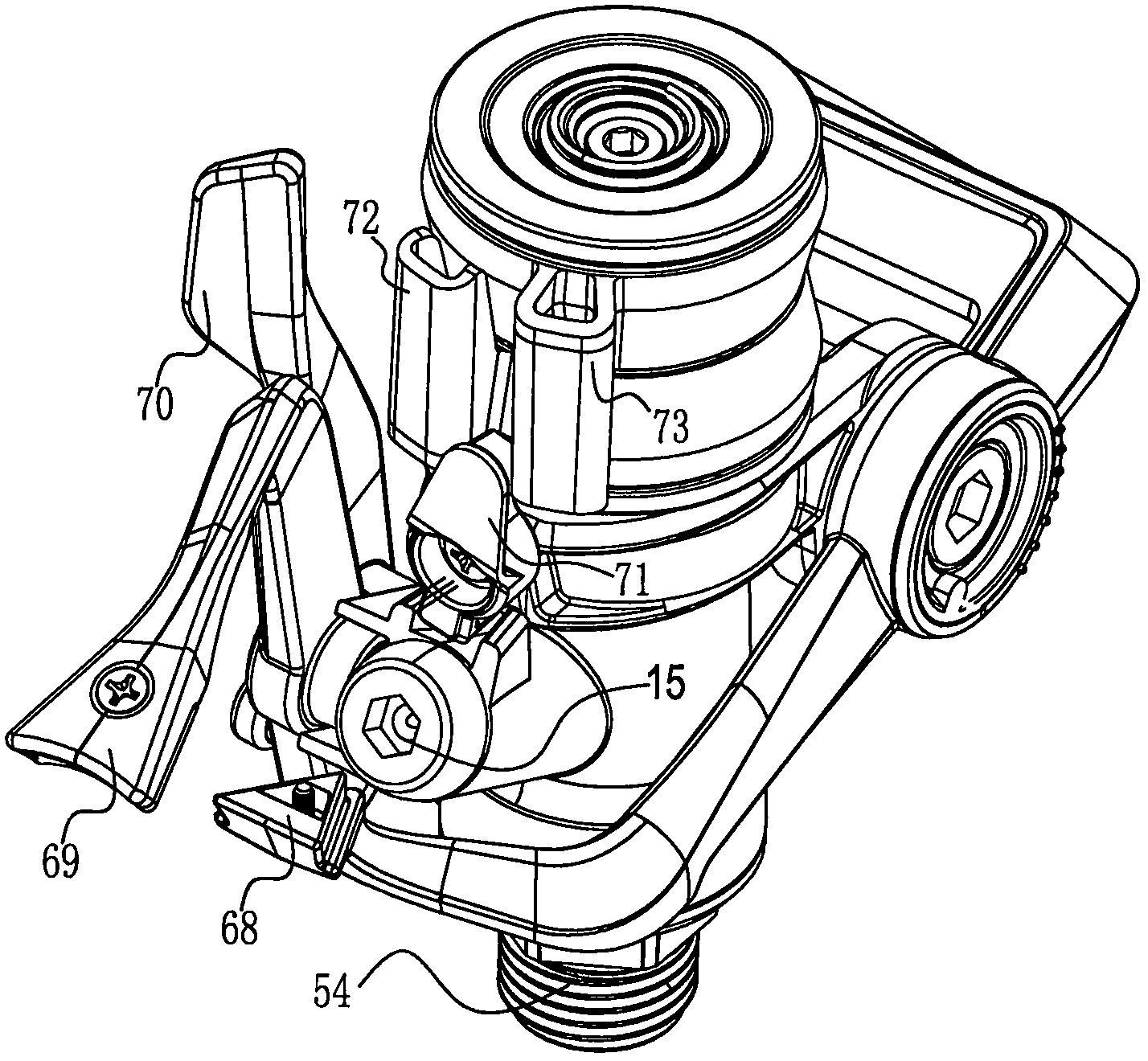 垂直击打式水鸟喷洒器用杠杆作用作垂直击打式机构简化了类似用多个半齿轮的复杂机构;垂直打水靶68的作杠杆作用的支点的水平转轴套的左右两端分别设有上下转齿套74、上下转活套75及上下转扭簧76作为杠杆支点轴以便垂直打水靶68的杠杆的头部上下移动而遮挡出水口,杠杆的头部设有抛物板m21b和左右分水板m21c,抛物板m21b是采用上下动作的垂直击打式方法来击打出水的垂直打水靶的抛物板,上挡杆69在抛物板m21b的上方的上止点挡住抛物板m21b,档位杆70的下端的档位销钉插入上挡杆69的下端的档位销钉长孔中以调配高低;左右分水板m21c设有一左一右的背靠背弧形分水板m21给左右换向提供动力,如此周而复始。