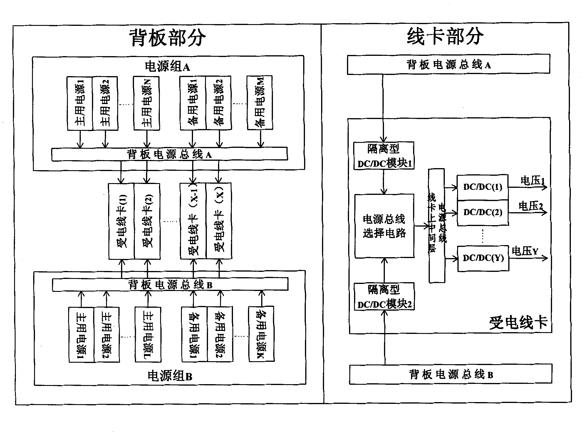 一种高可靠性电源系统,包括背板部分和线卡部分,其特征在于:在背板部分设置有至少两条背板电源总线,每一背板电源总线分别与每一受电线卡连接,其中每一背板电源总线都分别连接有N个主用电源和M个备用电源进行供电,其中N≥1,M≥0;线卡部分设置一电源总线选择电路,电源总线选择电路的输入端分别通过一个隔离型DC/DC模块与每一背板电源总线连接,电源总线选择电路的输出端连接线卡上中间层电源总线,线卡上中间层电源总线再连接每一DC/DC,输出电压。