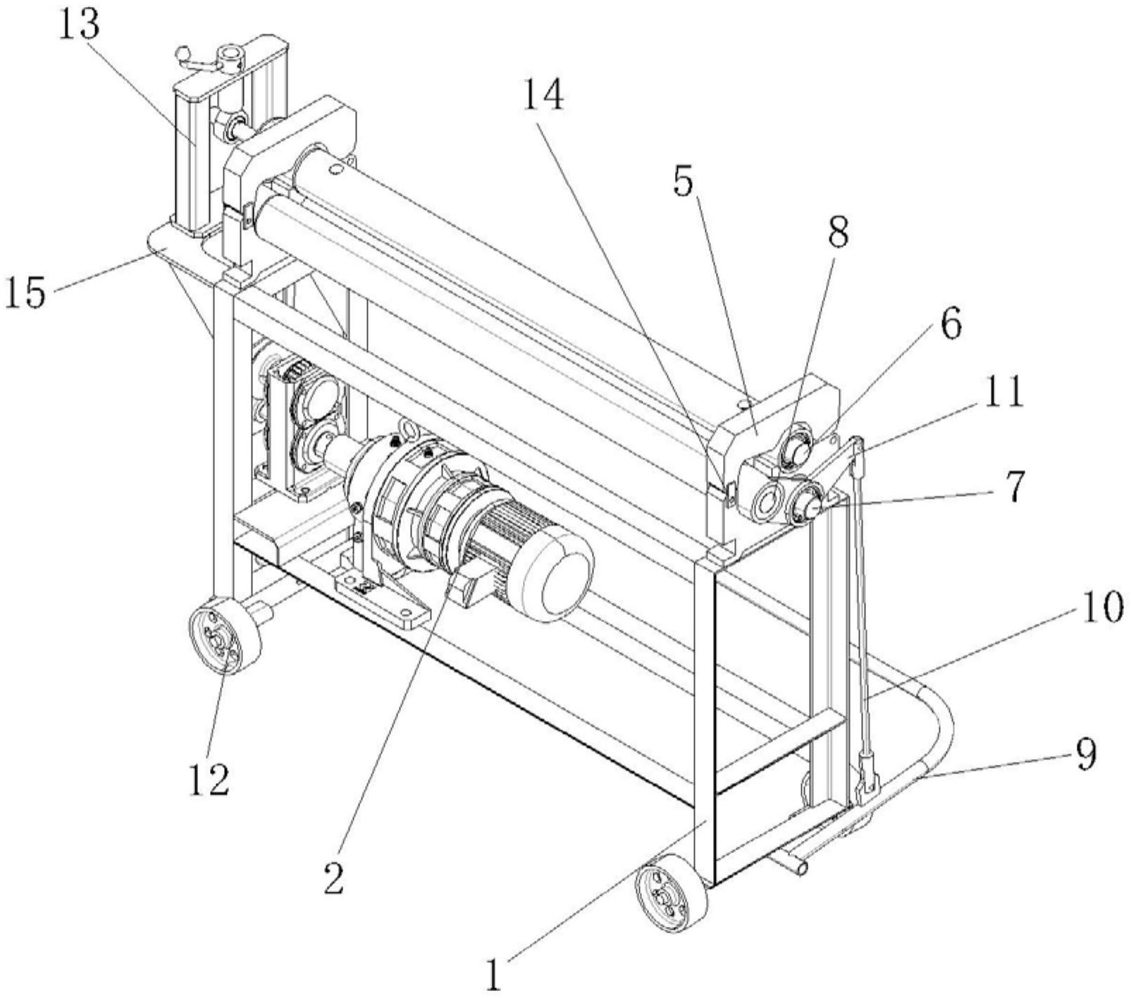 本实用新型涉及板材冷卷技术领域,尤其涉及一种卷板机。包括支撑架、设置于支撑架下部的驱动机构及设置在支撑架上部的卷板机构,所述卷板机构包括工作辊一、工作辊二和工作辊三,所述驱动机构的输出端分别与工作辊一、工作辊二连接,所述工作辊三设置在工作辊一、工作辊二连接下方且与工作辊一、工作辊二有间隙,还包括用于调节工作辊三靠近或远离工作辊一、工作辊二的调节机构,所述调节机构设置在工作辊三的一端外侧。本实用新型的有益效果是:本卷板机可以通过连接件来改变工作辊三的位置,相应的根据不同板材调整工作辊三与工作辊一和工作辊二之间的配合间隙。