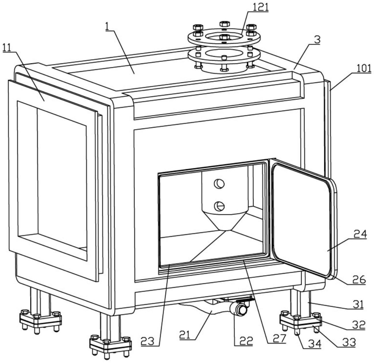 本实用新型属于烟气与空气混合技术领域,具体涉及一种烟气与空气混合装置,包括箱体,箱体远离进风口一侧设有出风口,漏斗下侧设有出水口,箱体下侧内壁设有锥形槽,箱体下侧设有与出水口相匹配的出水管,出水管另一端装配有球阀,箱体一侧设有检修口,箱门设有密封条,检修口四周设有与密封条相匹配的密封槽,四个支撑脚下端均固定连接有安装板,四个安装板均装配四个穿过缓冲垫的螺钉,本装置结构简单,对高温烟气与低温冷空气充分均匀混合后产生的大量冷凝水进行收集排放,防止冷凝水进入燃烧器,对燃烧器造成损坏,且箱体便于工作人员进行检修,并且便于将高温烟气均匀的送入箱体内,使高温烟气与低温冷空气充分混合。