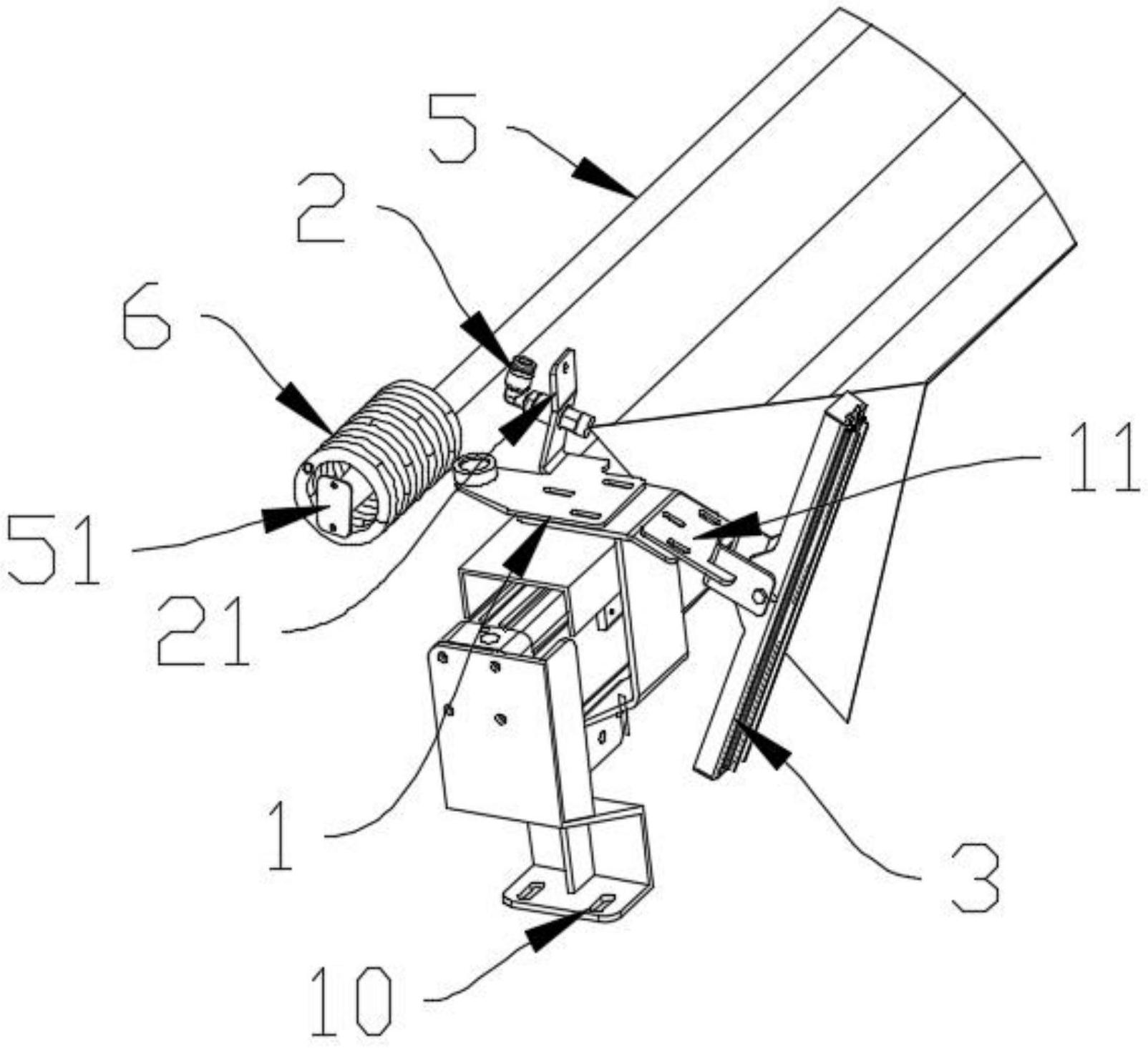 本实用新型公开了一种色选机喷水清灰装置,涉及色选机技术领域。本实用新型包括一安装支架,安装支架A上设置喷嘴和清灰刷;还包括一用于驱动安装支架A沿平行玻璃表面移动的驱动机构;驱动机构收到清灰指令后,安装支架随驱动机构开始移动,移动过程中,喷嘴在移动过程中喷水,此时清灰刷位于喷嘴移动方向的后侧,清灰刷在水后面清理附着在玻璃表面的脏污;当驱动机构完成一次前进运动后;控制喷嘴停止喷水,控制驱动机构带动安装支架A做返回运动。本实用新型通过采用一驱动机构驱动喷嘴和清灰刷沿平行玻璃表面移动,实现在一个往返过程中,通过单程喷水,两侧刮擦实现清理,解决了现有对于粘性物料清扫清理效果不理想的问题。