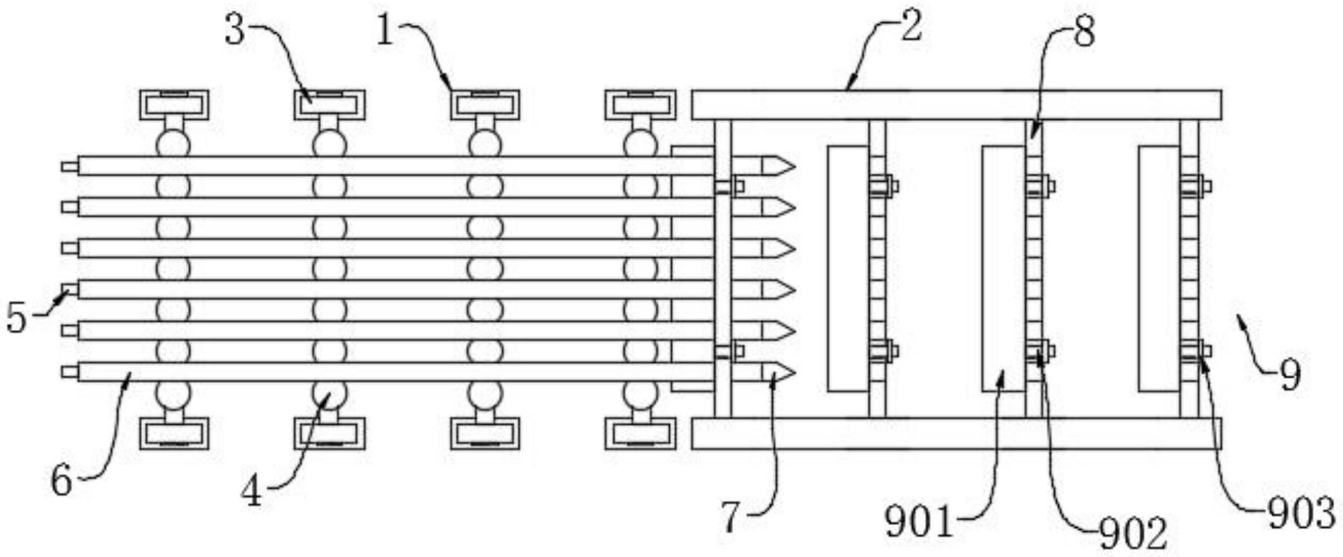 本实用新型公开了GGH穿管工装,涉及工装领域,本实用新型包括滚筒架和GGH框架,滚筒架的顶部安装有滚筒,滚筒的外表面套接有多个滚轮,多个滚轮的顶部均放置有螺旋翅片管。本实用新型通过设置有引导头,由于引导头为圆锥体且直径与螺旋翅片相同,因此在螺旋翅片管穿管时可套接在其进入端,使得在螺旋翅片管偏离穿管轨迹时能起到修正引导作用,确保螺旋翅片管在穿过孔板时不会因为螺旋翅片管运动轨迹偏离而引起螺旋翅片与孔板穿孔产生阻挡,甚至受较大阻力引起螺旋翅片歪道和焊接拉脱,精简了穿管工艺流程,减少了繁琐复杂的操作,减低了完成该工作的人力成本,提高了穿管效率,保证了产品的质量。