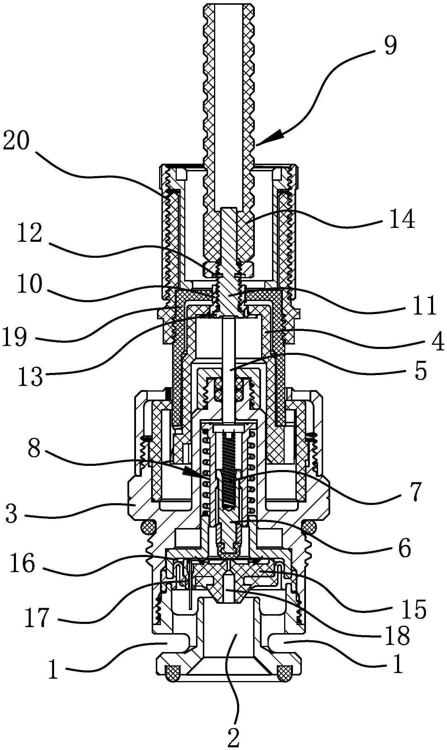 本实用新型提供了一种新型按压式阀芯,属于阀门技术领域。它解决了现有按压式阀芯不能调节流量的问题。本新型按压式阀芯,包括阀芯壳,该阀芯壳的上部设置有滑爪套以及伸缩机构,阀芯壳的下部具有过水通道,阀芯壳内还竖直设置有呈杆状的压杆、设置于压杆下方的密封芯子以及密封弹簧,密封弹簧的两端分别作用在压杆和密封芯子上,阀芯壳内还设置有回位机构,所述回位机构能作用在所述压杆和密封芯子上并使所述压杆和密封芯子上移,按压式阀芯还包括连接于所述滑爪套顶部的调节件,所述调节件能相对于滑爪套沿压杆的轴向移动并在移动后定位,所述压杆的上端抵靠在调节件的下端。本新型按压式阀芯具有适用性广的优点。