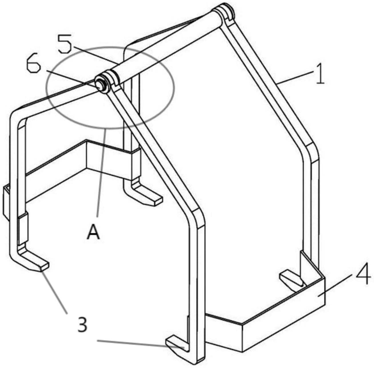 本实用新型涉及一种电压互感器的手提搬运工具,手提搬运工具包括吊臂和主轴;吊臂的上端设置有圆孔,下端设置有吊钩;主轴上嵌套有套管,主轴的两端通过吊臂上的圆孔分别嵌挂有四根吊臂,位于主轴两端最外侧的吊臂圆孔的外侧依次设置有两组垫片和卡簧,同一侧的两根吊臂之间固定有一个限位片,圆孔与主轴之间为转动连接;本实用新型解决了传统搬运方式中工人需要双手搬运电压互感器导致的不方便且效率低下问题,极其有利于工人手提搬运电压互感器,有效提高工作效率,具有十分出色的实用前景。