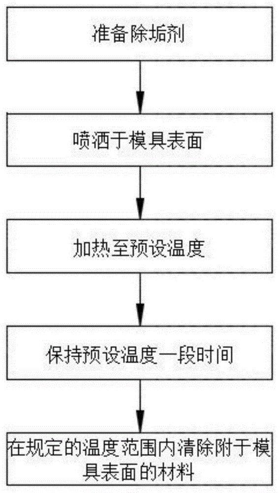 本发明公开一种压力凝胶模具除垢的方法,包括除垢剂,其中所述除垢剂包括有机溶剂,其中所述有机溶剂包括N‑甲基吡咯烷酮和三乙二醇;将除垢剂喷洒于待清洁模具表面;将所述模具加热至预设温度;保持所述预设温度一段时间;在规定的温度范围内清除附于模具表面的材料。本发明可在锁模机上操作,无需拆卸,简单快捷,清洁需时短;处理过程对模具无损伤,不影响模具寿命,不需重新做表面氧化或电镀处理,节约成本。