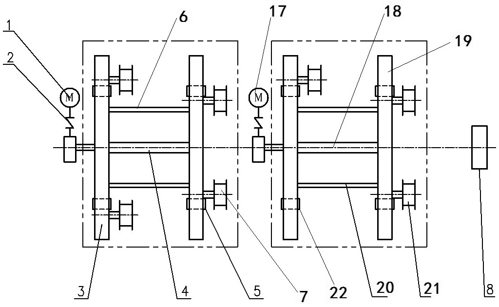 本实用新型涉及一种用于变压器换位导线生产的绞笼放线装置,属于变压器技术领域。技术方案是:由两个以上结构相同的放线单元组合而成,全部的放线单元共用一个换位头(8),换位头(8)位于最后一个放线单元后面,全部的放线单元主轴与换位头(8)位于同轴线上,每个放线单元由独立驱动系统驱动。本实用新型的有益效果是:在生产较少根数电磁线的换位导线时,只需根据生产需要启用相应个数的放线单元,减少了设备的无效磨损,同时有效降低了设备故障率,降低维修成本;另一方面可节约能源,减少不必要的能源浪费。采用分段式放线绞笼,减少链轮、链条、齿轮等强制退扭找正机构,减少设备故障率,使用灵活方便。