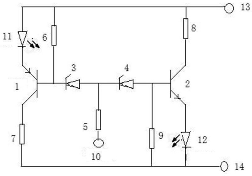 本实用新型涉及一种数字电平高低指示仪,属于电子数字电路技术领域。技术方案是:检测点(10)通过VD1稳压管(3)与PNP型三极管(1)的基极连接,通过VD2稳压管(4)和NPN型三极管(2)的基极连接;电阻器二(6)连接在PNP型三极管(1)的基极与发射极之间,电阻器五(9)连接在NPN型三极管的基极与发射极之间;绿色指示灯(11)连接在PNP型三极管(1)的发射极,红色指示灯(12)连接在NPN型三极管的发射极。本实用新型的有益效果是:不仅可以检测出电路的高电平、低电平与高阻状态,还可以测出电路中是否存在脉冲信号,检修时只需知道有无信号;减少冗余,设计简单,便于操作,指示灯即时显示状态。