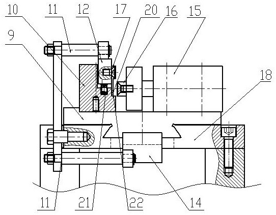 本实用新型涉及一种专用于铜扁线冷压焊接的装置,属于电磁线冷压焊接技术领域。技术方案是:上压紧块(17)、正向压紧块(16)和L型固定块台阶(22)一起构成铜扁线的冷压焊接模具,对放置在L型固定块台阶(22)上的铜扁线进行冷压焊接;燕尾滑块组件(9)上设有推挡块(14),动力源组件(4)通过杠杆机构(6)与推挡块(14)接触连接,推动推挡块(14)及燕尾滑块组件(9)在燕尾滑轨支座(18))上滑动;上压紧机构(12)通过摆臂机构(11)与推挡块接触连接,推挡块带动上压紧机构移动。本实用新型的有益效果:能够实现四面约束,为通用型夹紧机构,适应产品的多样化需要,实现一套模具适用多种线规的焊接。