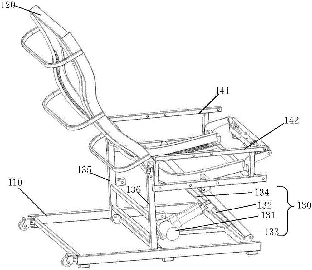 本实用新型提供一种按摩椅支架及按摩椅,该按摩椅支架包括:底座,背导轨,背导轨位姿调整机构,所述底座与所述背导轨通过所述背导轨位姿调整机构连接,所述背导轨位姿调整机构,包括:蜗轮蜗杆电机,所述蜗轮蜗杆电机的蜗杆的另一端铰接于第一连接杆;所述第一连接杆的两端分别固定连接于第二连接杆、第三连接杆;所述背导轨的底后部两侧分别铰接有第四连接杆的一端、第五连接杆的一端;所述第四连接杆的另一端与所述底座铰接,所述第五连接杆的另一端与所述底座铰接。本实用新型利用三角形的稳定性,来稳定的调整背导轨的位姿,与现有技术中仅通过在单一支架和滑轨结合位移的方案相比,能够实现按摩椅的位姿调整稳定,给用户以更好的体验。
