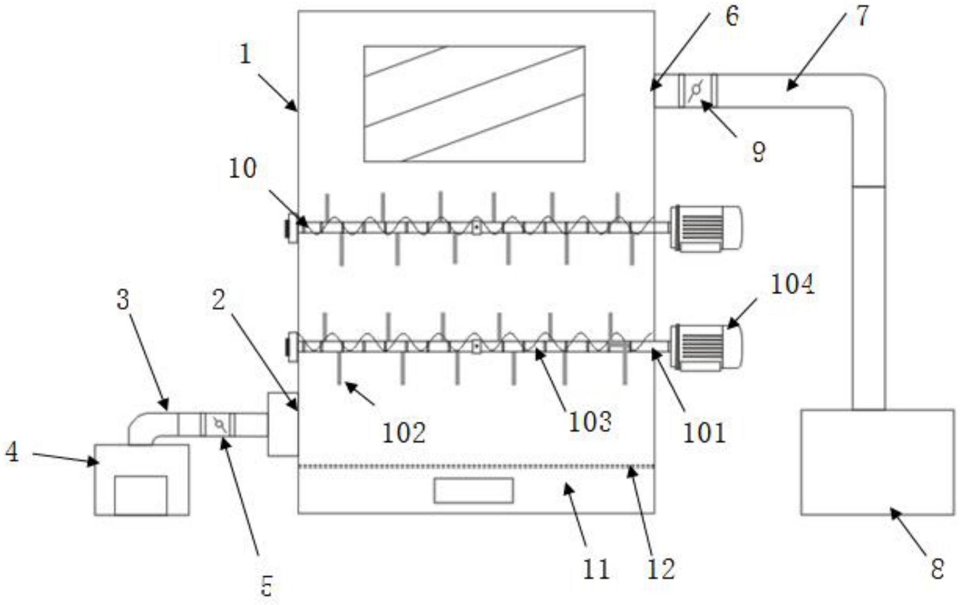 本实用新型公开了一种快捷去除羽绒铁屑的设备。该快捷去除羽绒铁屑的设备包括除铁仓,除铁仓的一侧侧壁设置有进绒口,另一侧侧壁设置有出绒口,出绒口与进绒口处在不同的高度,出绒口处设置有抽风机,抽风机使得除铁仓处于负压状态,出绒口和进绒口之间设置有若干个吸铁装置,吸铁装置包括与除铁仓枢接的转轴,转轴为铁质,转轴的外周面均匀分布有若干个搅拌杆,转轴外周面避开搅拌杆的地方缠绕有导电线,转轴的一侧端面固接有驱动装置。本实用新型解决了现有技术处理羽绒铁屑时容易产生二次污染的问题,同时解决了现有技术处理被吸附的铁屑时,工作效率低下,影响正常生产的问题。