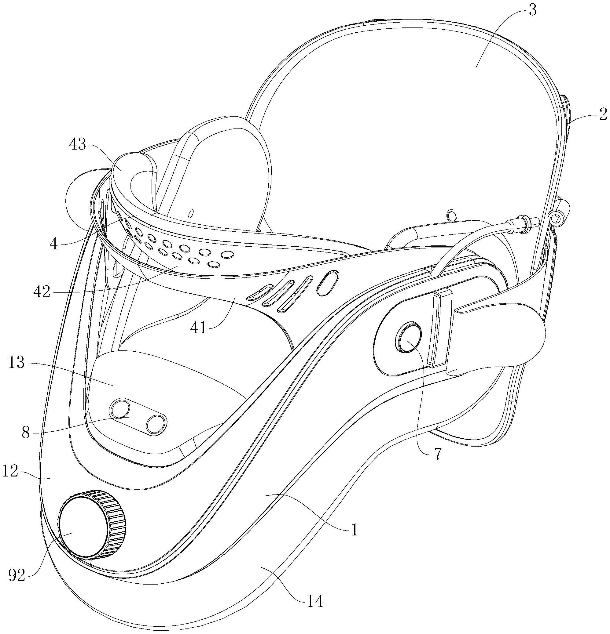 本实用新型提供一种颈部固定器,包括胸部面板、背板、气垫托板、下巴托板、气泵及气管,背板通过绑带连接于胸部面板上,胸部面板与背板围合形成供颈部穿戴的空间,气垫托板安装于背板内侧,以供贴合于颈部的后侧面,下巴托板安装于胸部面板上以供支撑人的下巴,气泵安装于胸部面板内,气泵通过气管连接气垫托板,胸部面板上设置有用于控制气泵启停的开关键。该颈部固定器通过开关键可启动气泵向气垫托板充气或停止充气,从而实现气垫托板的快速充气,提高了使用的便利性。