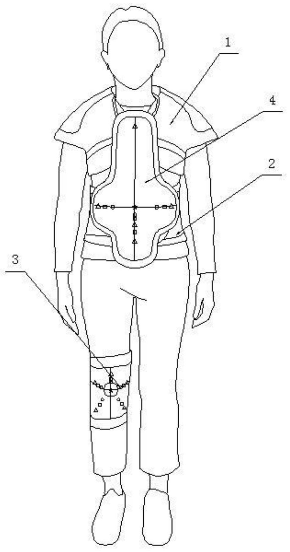 一种简易穴位寻找装置,涉及一种医疗设备与设施,包括肩甲、腰带、护膝及胸甲,肩甲绑在人体肩膀位置,腰带绑在人体腰间,护膝绑在人体腿部,胸甲穿戴在人体胸前位置,所述的肩甲包括甲体A、肩井穴定位块、大椎穴定位块、神道穴定位块、肩贞穴定位块、肩峰穴定位块,所述的大椎穴定位块位于甲体A的中轴线上,通过肩甲、腰带、护膝及胸甲的辅助,使普通人能够准确找到肩甲上的肩井穴、神道穴、肩贞穴及肩峰穴,腰带上的志室穴、命门穴、腰阳穴及腰眼穴,护膝上的内膝眼穴、犊鼻穴、三足里及鹤顶穴,胸甲上的关元穴、檀中穴、中脘穴及气海穴,此寻穴装置能够准确的寻找到需要的穴位,给使用者带来方便。