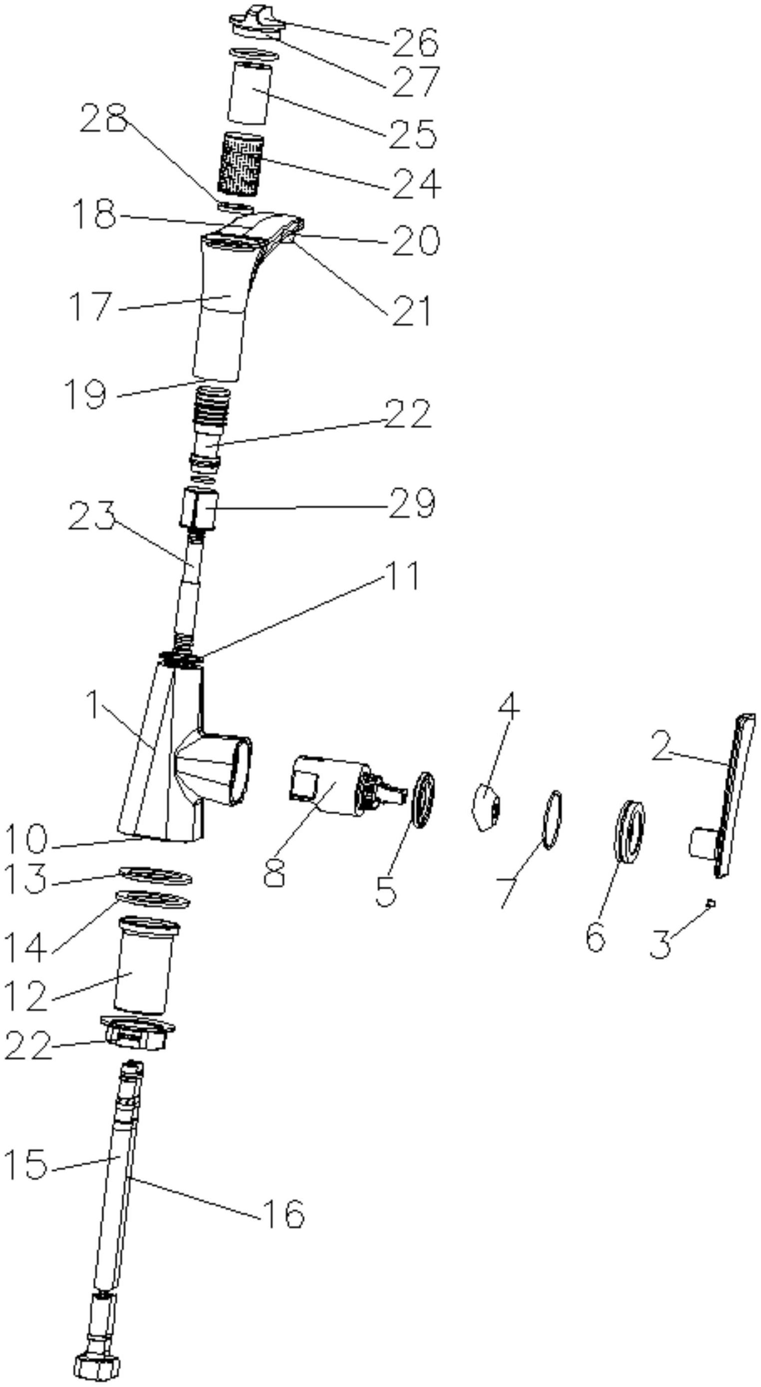 本实用新型公开了一种过滤龙头,包括具有第一进水口和第一出水口的阀体、出水部分、把手、内六角螺丝、第一装饰盖、阀芯压盖、螺母盖、第一O型密封圈、连体阀芯、安装管螺母、牙管、第一平垫圈、第一平垫圈、冷水进水管、热水进水管,其中出水部分由出水座和出水管组成,阀体与出水座之间通过出水接头和连接管相接连通,出水腔内设有过滤网,过滤网内设有PP棉滤棒,出水腔上端通过第二装饰盖密封,第二装饰盖与出水座连接,螺母盖将连体阀芯拧紧在阀体上,把手通过内六角螺丝连接到连体阀芯上,本实用新型在出水腔内增加了过滤网和PP棉滤棒,就能实现三层过滤,具有结构新颖、使用灵活的特点,广泛适用于盥洗室或厨房内台盆、水槽配套安装。
