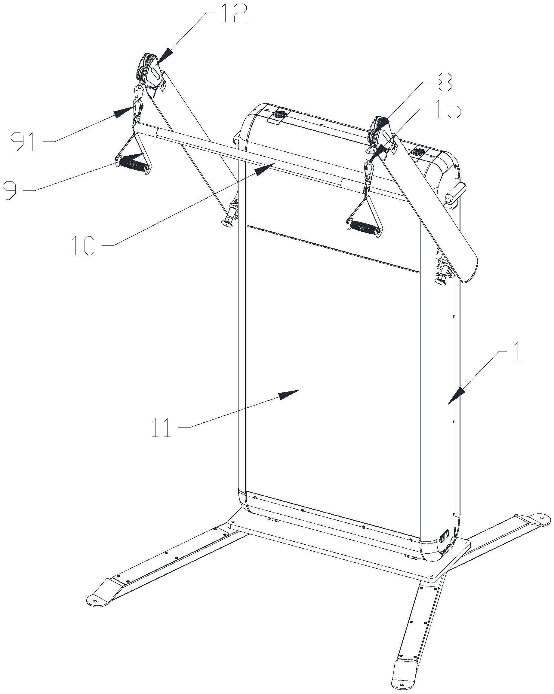 本实用新型公开了内置空压机的阻力健身器械,包括健身机架,健身机架上设置有依次相连通的空气压缩机、储压气罐、缓冲气罐和活塞气缸,储压气罐和缓冲气罐之间设置有电磁阀,缓冲气罐上设置有泄压阀,健身机架上还对称设置有两组滑轮组,每组滑轮组均包括设置在健身机架顶部的第一定滑轮、导向定滑轮、设置在健身机架侧臂上的第一导向轮、固定臂,每个第一定滑轮上均设置有拉力绳,活塞气缸的活塞杆顶部设置有两个动滑轮,每个拉力绳的自由端均绕过动滑轮后依次经过导向定滑轮、第一导向轮并至固定臂穿出与三角拉手可拆卸连接,本实用新型的目的在于提供内置空压机的阻力健身器械,结构简单,还有效避免了拉力绳发生缠绕。