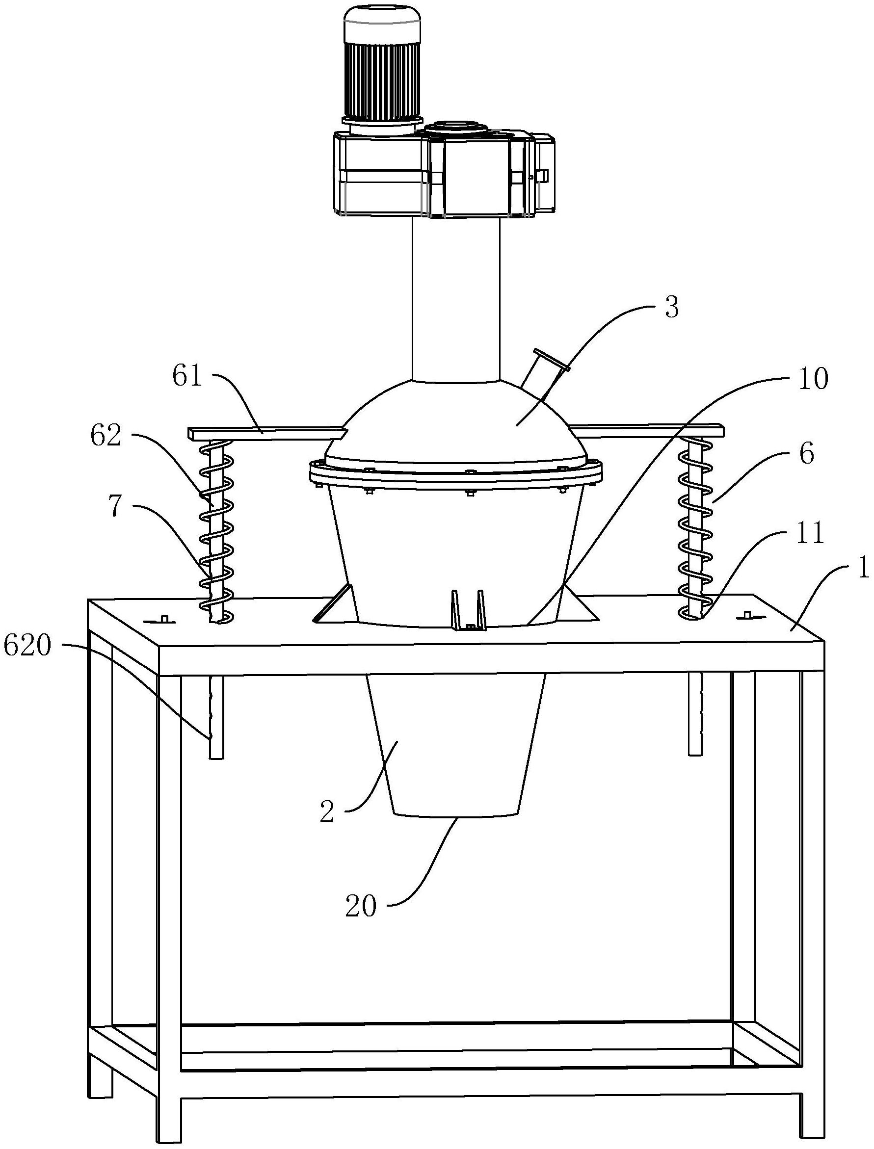 本申请涉及一种筒盖可拆式单锥螺旋型真空干燥机,涉及真空干燥机技术领域。其包括工作台、筒体、筒盖和螺旋搅拌叶,工作台上设置有供筒体固定插设的安装孔,筒体底部设置有出料口,筒盖用于封盖筒体顶部开口,螺旋搅拌叶设于筒体内,螺旋搅拌叶中穿设有搅拌轴,搅拌轴与筒盖转动连接,筒盖侧壁设置有若干支撑机构与工作台相连,支撑机构包括连接杆和支撑杆,连接杆一端与筒盖侧壁固定连接,另一端与支撑杆的端部固定连接,工作台上贯穿设置有供支撑杆穿设的支撑孔,支撑杆与工作台滑动连接,支撑孔内壁设置有锁止组件,锁止组件用于将支撑杆固定在工作台上。相较于相关技术,本申请具有能够直面的观测到清洗状态的效果。