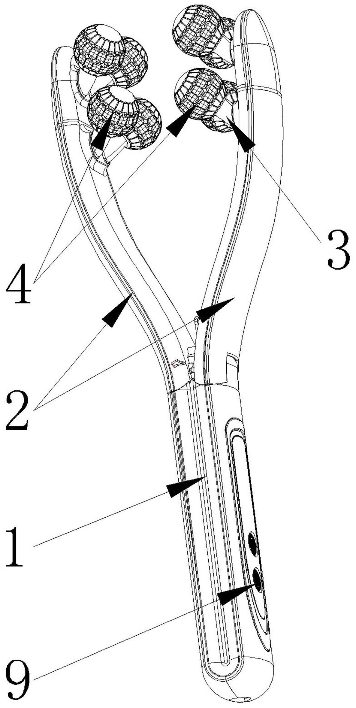 本实用新型旨在提供一种按摩范围大且适应性好的脸部按摩器。本实用新型包括手柄以及一对转臂,一对所述转臂均铰接配合在所述手柄上,所述转臂上设置有若干组按摩组件,所述按摩组件包括两个对称设置的转动支架,所述转动支架转动配合在所述转臂上,所述转动支架远离所述转臂的一端转动配合有按摩球。本实用新型应用于按摩设备的技术领域。