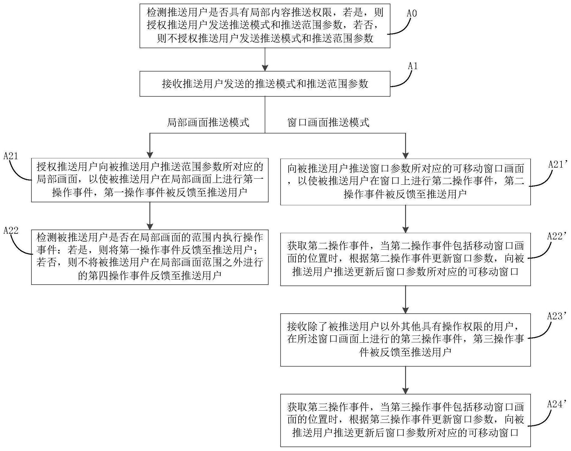 本发明涉及计算机多媒体领域,更具体地,涉及一种坐席系统的内容推送方法、系统、存储介质和设备。推送方法用于服务器,包括以下步骤:接收推送用户发送的推送模式和推送范围参数;当接收的推送模式为局部画面推送模式时,授权推送用户向被推送用户推送范围参数所对应的局部画面,以使被推送用户在局部画面上进行第一操作事件,第一操作事件被反馈至推送用户;当接收的推送模式为窗口画面推送模式时,向被推送用户推送窗口参数所对应的可移动窗口,以使被推送用户在窗口画面上进行第二操作事件,第二操作事件用于反馈至推送用户;获取第二操作事件,根据第二操作事件更新窗口参数,向被推送用户推送更新后窗口参数所对应的可移动窗口。
