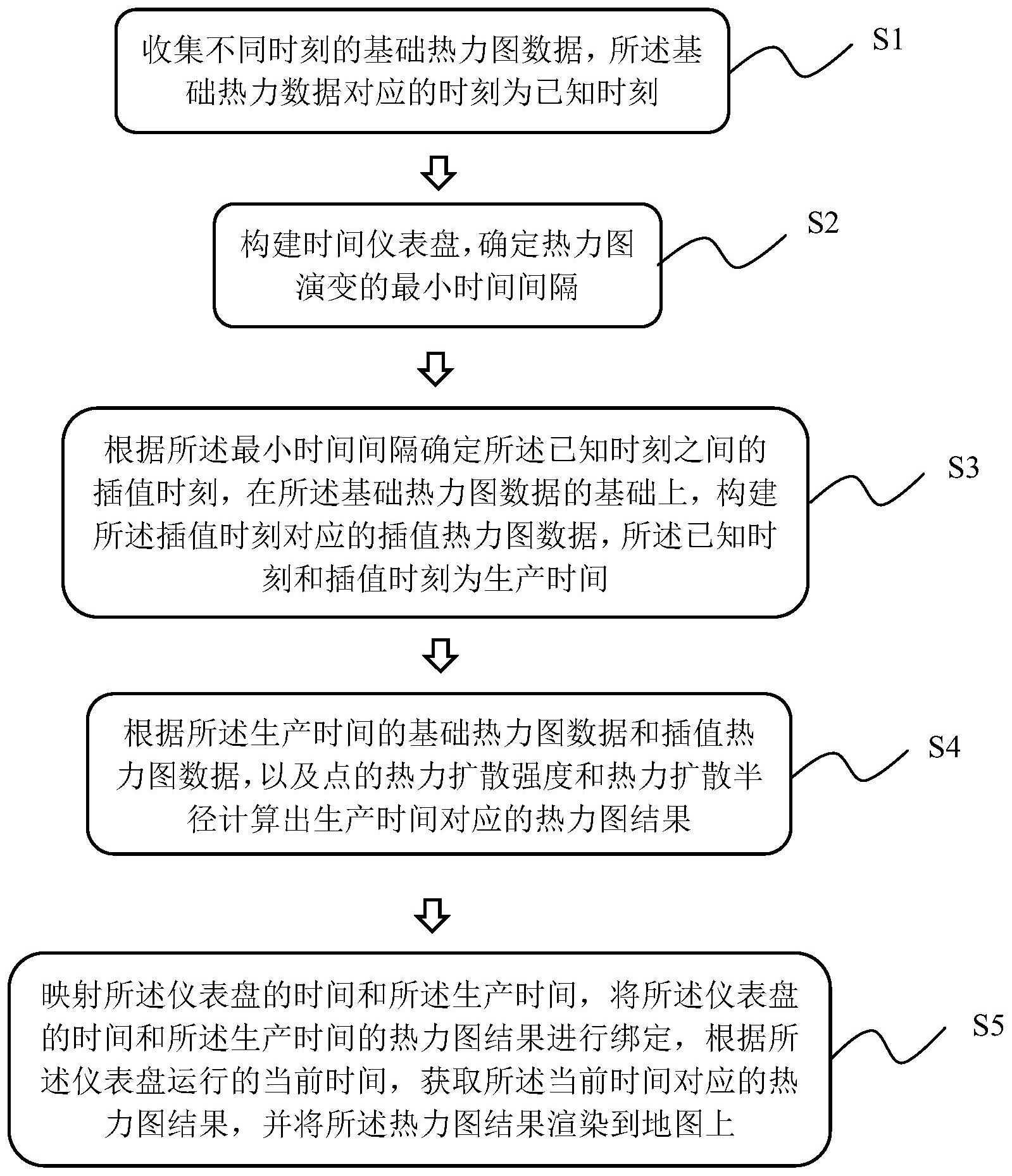 本发明涉及图像处理技术领域,更具体地,涉及一种热力图连续动态演变可视化方法及系统。用于解决热力图之间时间跨度大,导致动态演变结果出现突变和渲染闪烁的问题。此种热力图连续动态演变可视化方法,包括收集不同时刻的基础热力图数据;构建时间仪表盘,确定热力图演变的最小时间间隔;根据所述最小时间间隔以及收集的所述基础热力图数据,构建所述插值热力图数据;计算出生产时间对应的热力图结果;映射所述仪表盘的时间和所述生产时间,获取所述当前时间对应的热力图结果,并将所述热力图结果渲染到地图上。通过上述技术方案,以实现热力图动态演变过程连续化、精细化和可视化的技术效果。