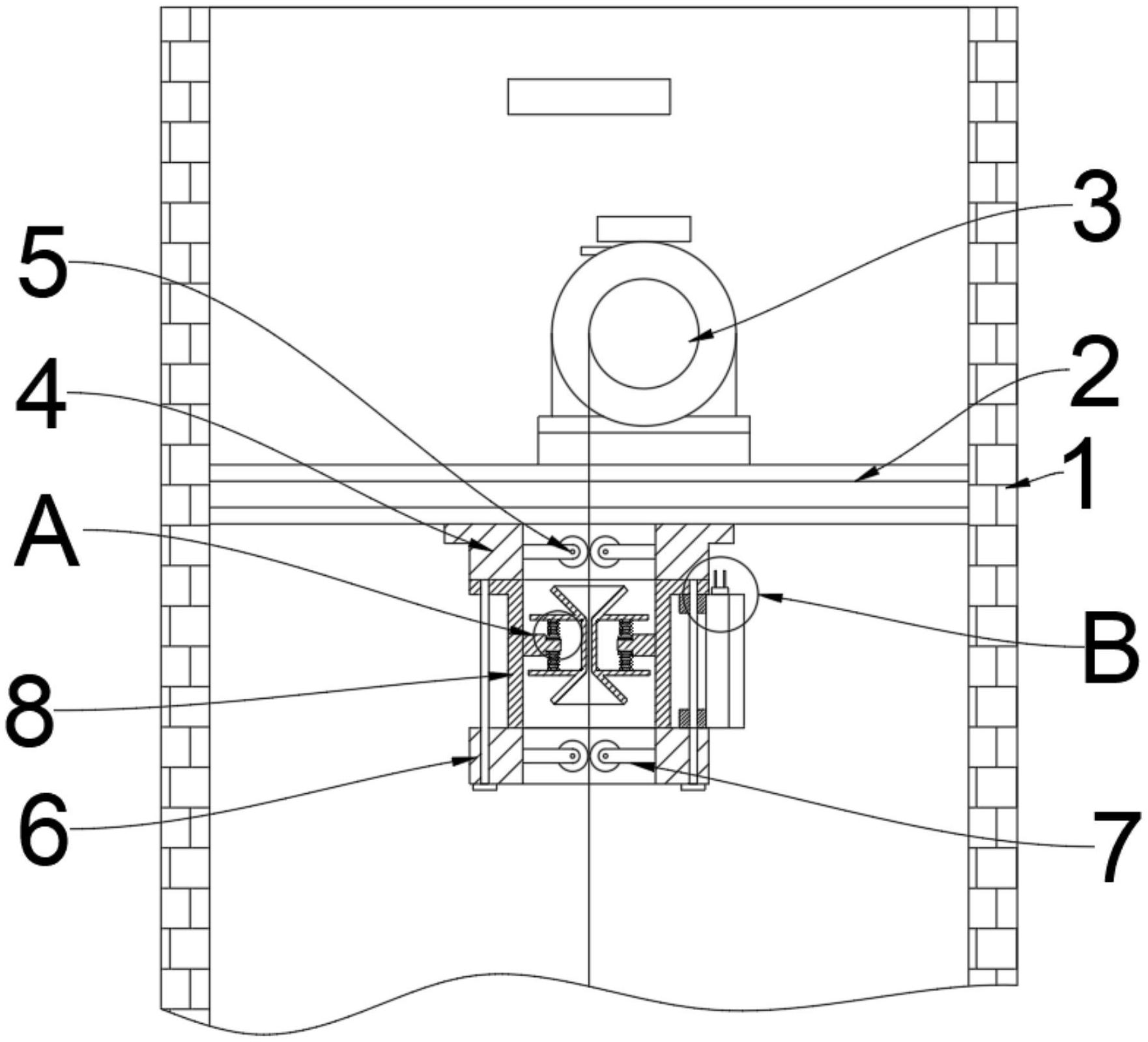 本实用新型公开了一种电梯钢丝绳断股自检测保护装置,涉及电梯检测保护技术领域,为解决现有的电梯钢丝绳在长期使用下会出现断股现象,使用者在不知情的情况下乘坐安装有断股钢丝绳的电梯时,容易引发安全事故的问题。所述电梯井的内部安装有安装横板,所述安装横板的下端安装有第一限位支架,所述第一限位支架与安装横板固定连接,所述第一限位支架下端的两侧均安装有限位轴,所述限位轴的外部安装有检测支架,所述限位轴的下端安装有第二限位支架,所述第二限位支架与限位轴固定连接,所述检测支架内部两侧的上下两端均安装有压力传感器,所述压力传感器与检测支架固定连接。
