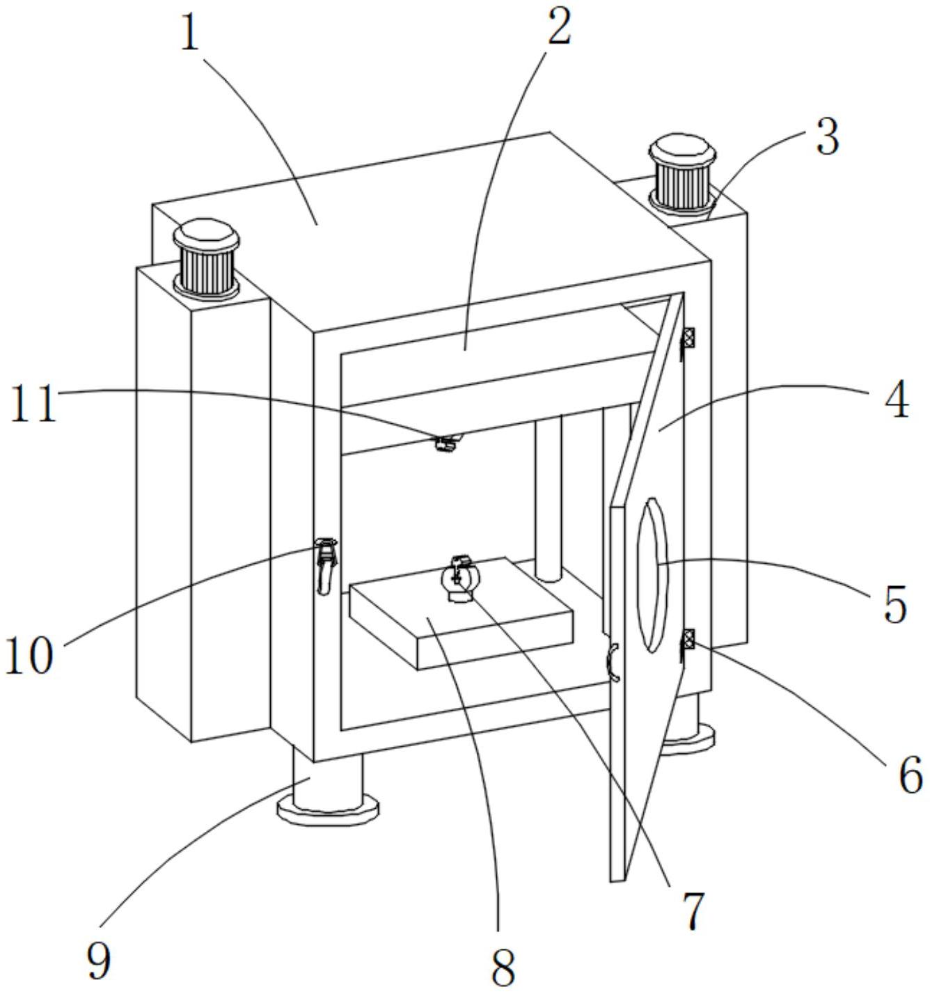 本实用新型公开了一种电梯用钢丝绳的弹性伸长的检测装置,包括防护箱主体,所述防护箱主体的左右两侧固定安装有升降组件,所述防护箱主体内腔的上部设置有升降板,所述防护箱主体内腔的底部固定安装有安装板,所述安装板上端外表面固定安装有下夹具,所述防护箱主体的前端外表面设置有防护门,所述升降板下端外表面的中部固定安装有拉力传感器,所述拉力传感器的下端外表面固定安装有上夹具,所述升降板下端外表面的右侧固定安装有安装组件,所述安装组件的下端外表面固定安装有测距仪。本实用新型所述的一种电梯用钢丝绳的弹性伸长的检测装置,具备便于稳定的控制升降板的升降,便于钢丝绳的弹性伸长量,且安全,测距仪便于安装拆卸等优点。