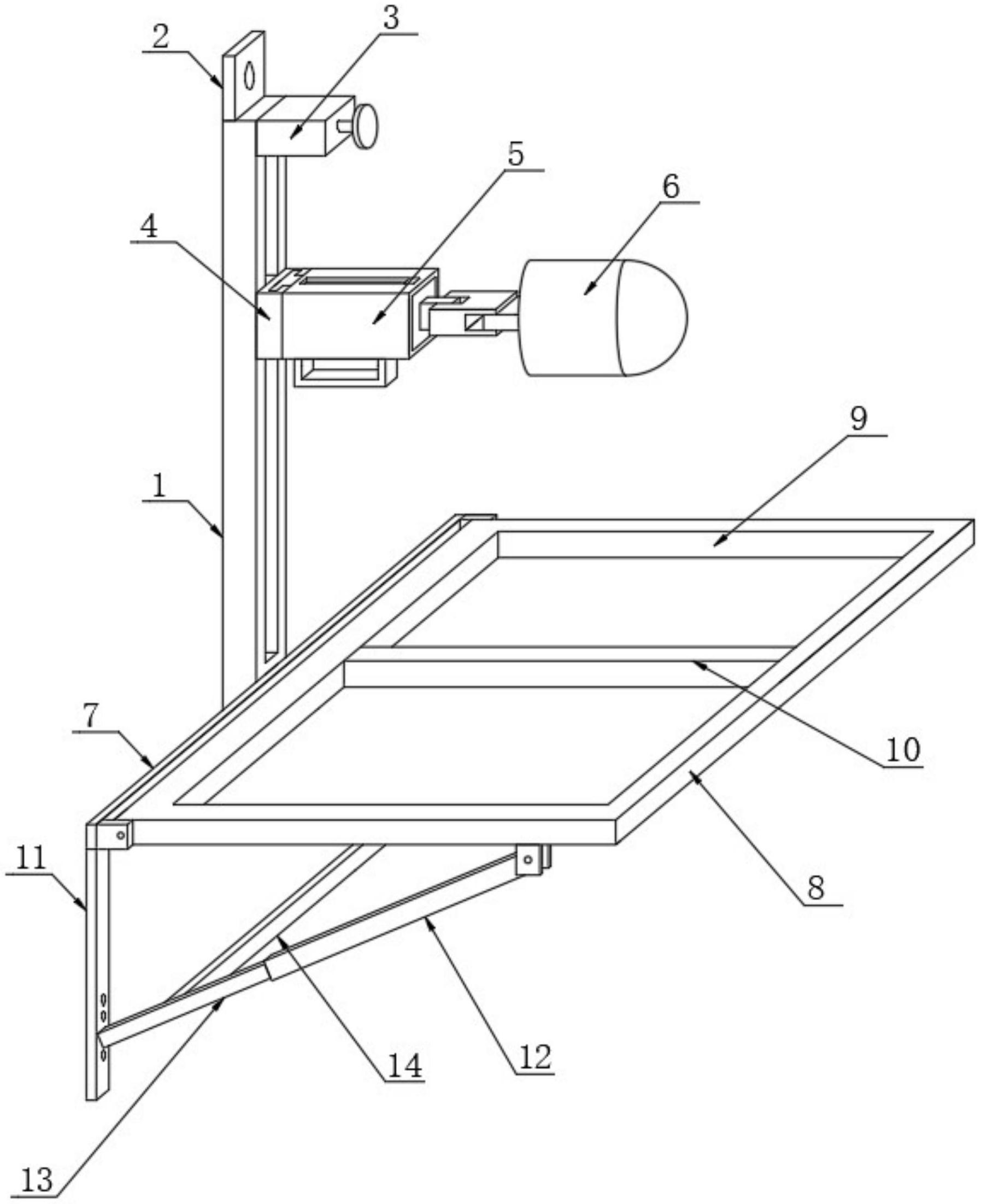 本实用新型公开了一种可用于电梯井检修的照明灯,包括调节板,所述调节板的顶部和底部对称固定连接有固定块,所述调节板的右侧上端固定连接有固定壳体,所述调节板的右侧壁体开设有调节槽,所述调节槽的内腔转动连接有丝杆,所述丝杆的外部套设有螺纹升降块,所述丝杆的上端固定连接有第一锥形齿轮,所述固定壳体的内部转动连接有转动轴,所述转动轴的外端设置有手轮。该可用于电梯井检修的照明灯,通过设置的调节槽、丝杆、螺纹升降块、第一锥形齿轮、转动轴、第二锥形齿轮、手轮、安装块的相互配合可以方便对照明灯进行高度的调节,便于在使用时对不同高度进行照明,T形卡块和T形卡槽的设置便于照明灯的拆卸。