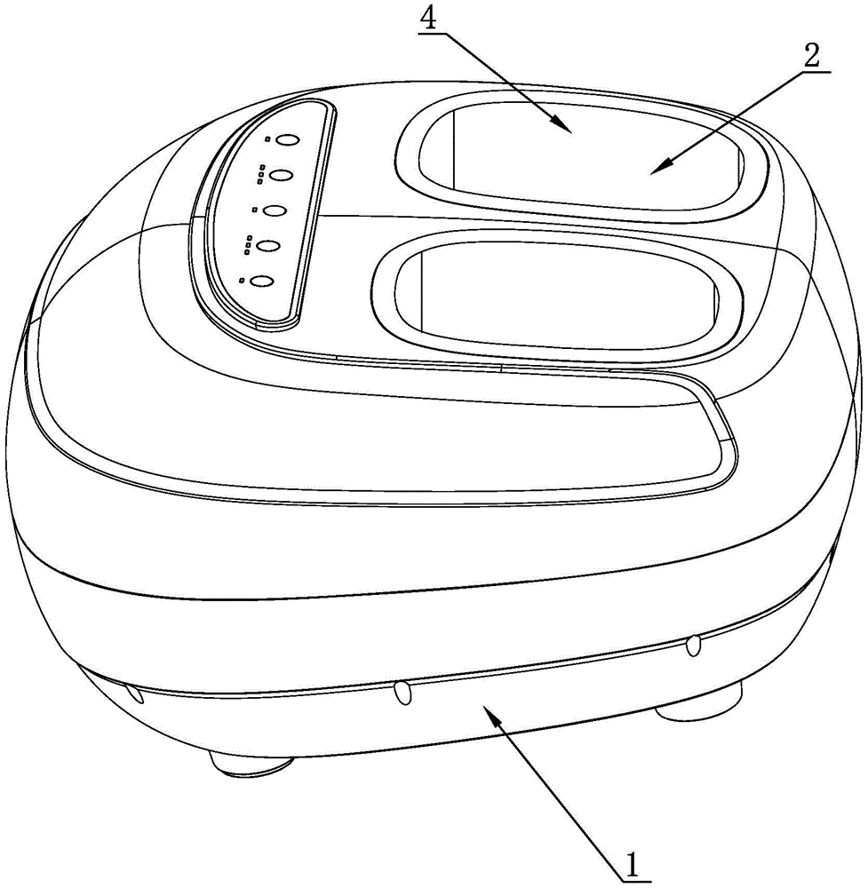 本实用新型涉及一种足疗机,机体内设足部按摩腔、按摩器容置腔以及脚套,按摩器容置腔内设前、中、后段按摩单元,按摩器容置腔包括左、右容置腔,前段按摩单元包括转动设置的第一辊轴、套设在第一辊轴上的两第一滚筒,两第一滚筒对称设置在左、右容置腔内,中段按摩单元包括转动设置的第二辊轴、套设在第二辊轴上的两第二滚筒,两第二滚筒对称设置在左、右容置腔内,还设第一齿轮、第二齿轮以及驱动齿轮转动的电机,第一辊轴穿设第一齿轮,第二辊轴穿设第二齿轮,后段按摩单元包括铰接在按摩器容置腔内的升降座,升降座向分别向左、右容置腔延伸有升降架,还设有驱动升降架上下移动的驱动机构。本实用新型提供的足疗机,结构简单,且按摩效果好。