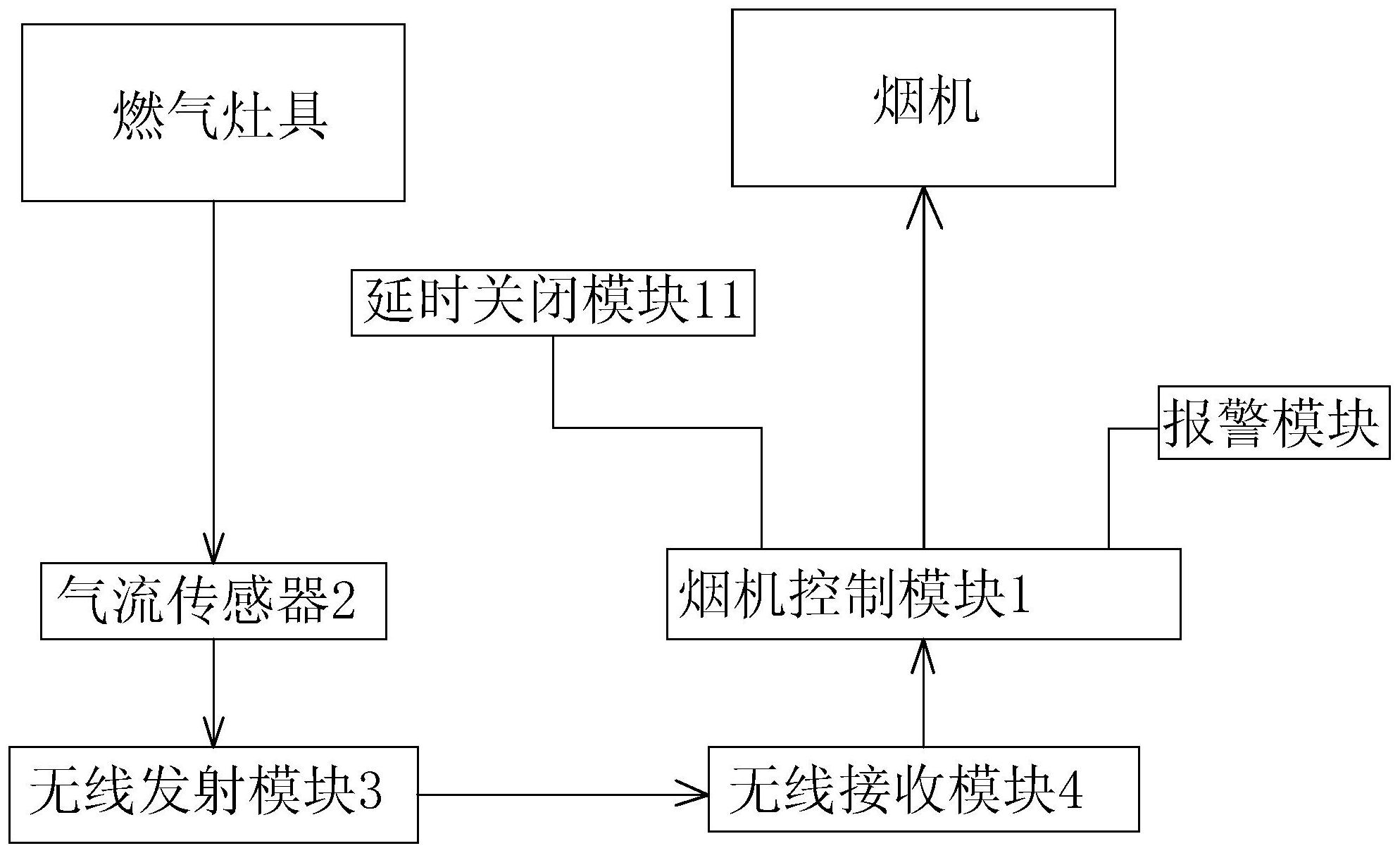 本发明公开了一种燃气灶具与烟机的联动安防系统,包括燃气灶具及烟机,所述烟机上设置有能够控制烟机启动或关闭的烟机控制模块,包括设置在燃气灶具的进气管道上的气流传感器,所述气流传感器的信号能够传送至烟机控制模块,所述烟机控制模块能够根据气流传感器的信号启动或关闭烟机,即当燃气灶具开启时,燃气发生流动,即可触发气流传感器,气流传感器将气流信号发送至烟机控制模块,烟机开关模块控制烟气打开,即可实现燃气灶具与烟气的联动控制,无需人工操作,安全可靠。