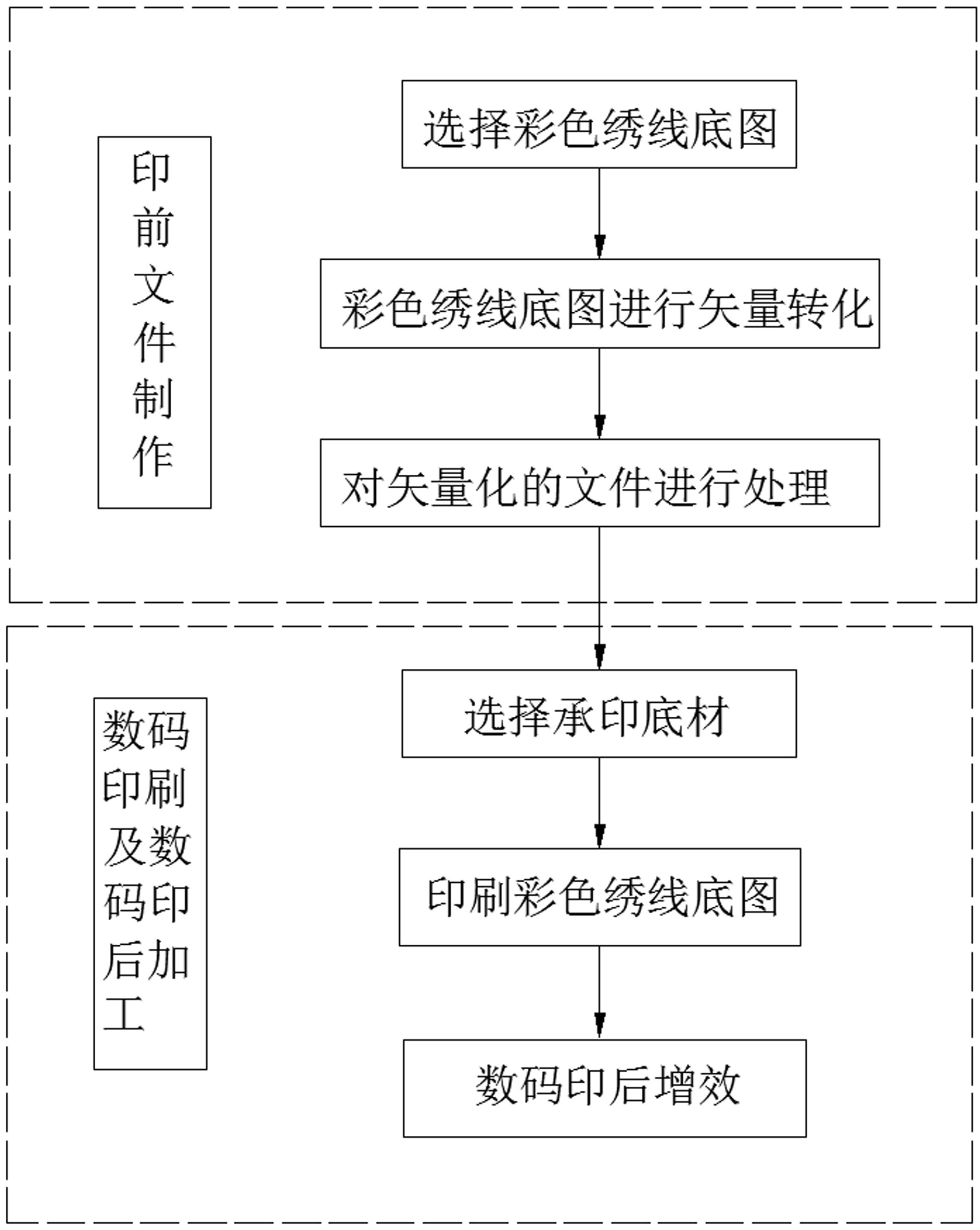 本发明涉及一种具有刺绣效果的数码印刷工艺,包括如下步骤:1)印前文件制作;2)数码印刷及数码印后加工。实现了刺绣效果的跨领域应用,结合刺绣线条堆积感的特点,对线条粗细、线条间距和线纹的疏密进行合理排列,最终通过数码光油喷印方式在印刷好的彩色底图上喷印出具有绣线视觉和触觉质感的刺绣效果,对彩色图案进行了具有视觉震撼力的增效处理,能够使刺绣这种精美的效果应用在更多装饰类产品上,包括宣传册、卡片、包装等,在效果的应用方面具有重大的突破,可以在纸张、塑料、甚至金属上实现这种效果。