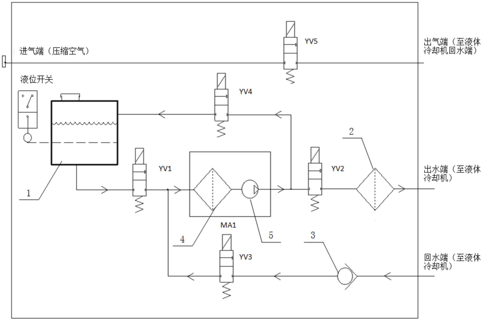 本实用新型公开了一种液体冷却机检测装置,包括:气体控制模块和循环水控制模块;所述气体控制模块的进气端接入压缩空气,出气端连接液体冷却机的回水端;所述循环水控制模块包括:蓄水箱、注水控制单元和泄放水控制单元;所述注水控制单元的进水端连接所述蓄水箱,出水端连接所述液体冷却机的入水端;所述泄放水控制单元的进水端连接所述液体冷却机的回水端,出水端连接所述蓄水箱。此液体冷却机检测装置可实现在流水线上完成对液体冷却机的检验工作,相对于目前通过逐台加装冷却液的方式而言,可大幅提高加注、泄放冷却液的效率,并实现定量控制。