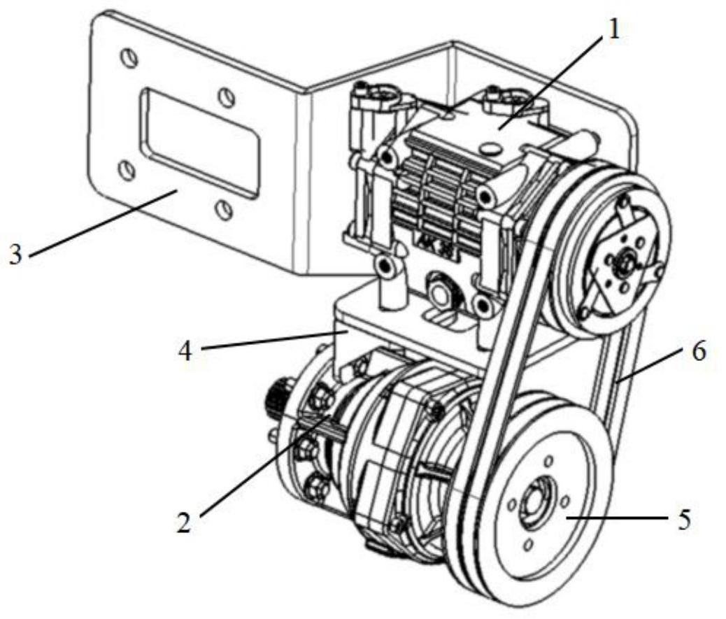 本发明属于车载空调系统技术领域,具体涉及一种完全独立于驾驶舱的方舱空调系统动力供给装置。该装置包括压缩机、取力器、压缩机支架、取力器支架、皮带轮和皮带。空调动力源自取力器动力输出,通过皮带传动,驱动空调压缩机,为空调系统提供动力输入。本发明相对传统电动空调系统,节约成本,能够降低高压供电带来的安全风险,提供了一种新的空调系统动力供给方案。