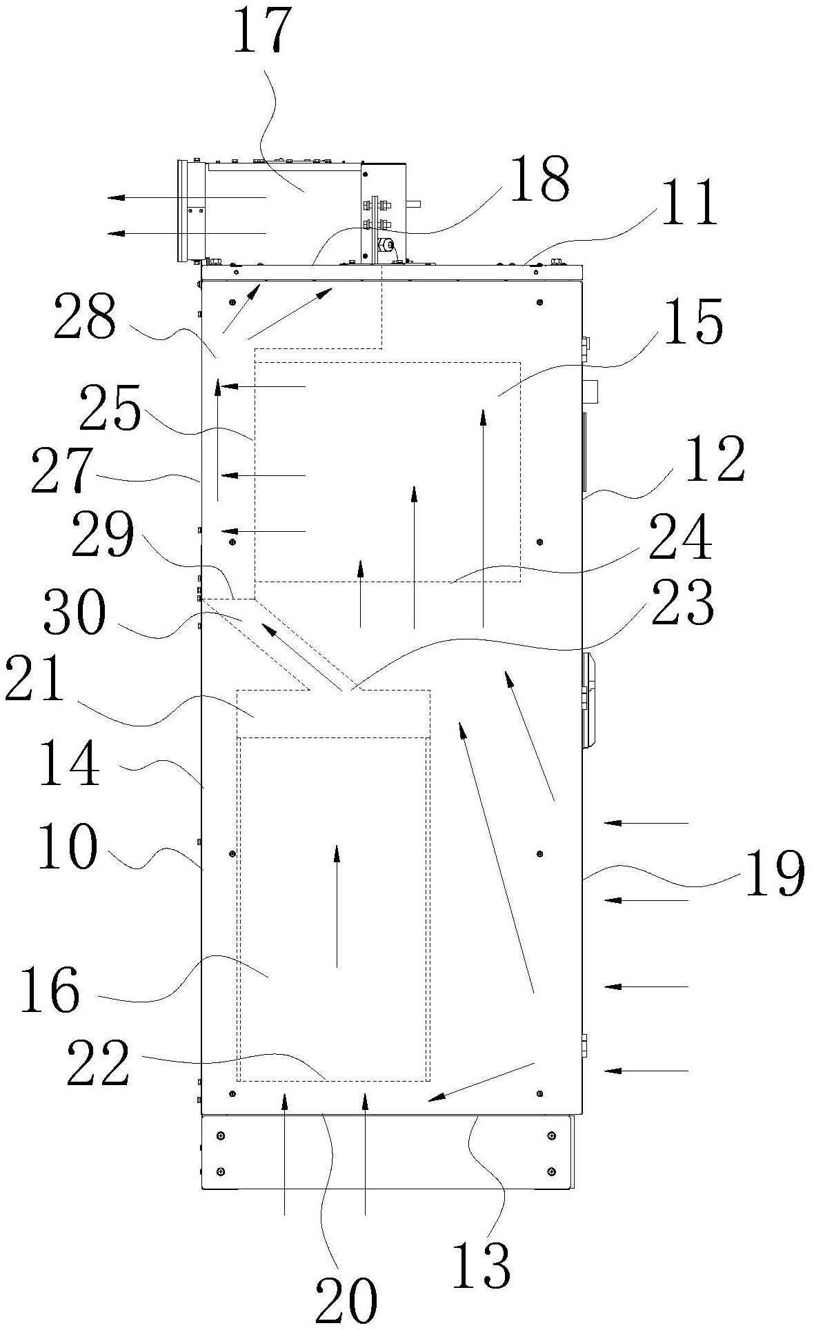 一种电解制氢电源装置及具有其的制氢设备,一种电解制氢电源装置包括:若干个串联设置的电源转换柜,电源转换柜包括箱体、功率模块、电感和设置于箱体上的散热风扇,功率模块设置于箱体内的上部空腔,电感设置于箱体的下部空腔,顶板的设置散热风扇位置处设置有第一出风孔,前板设置有第一进风孔,底板设置有第二进风孔。功率模块和电感分开设置于箱体的上部空腔和下部空腔,内部结构合理,通过两路冷风进行散热,散热效率高,成本低。