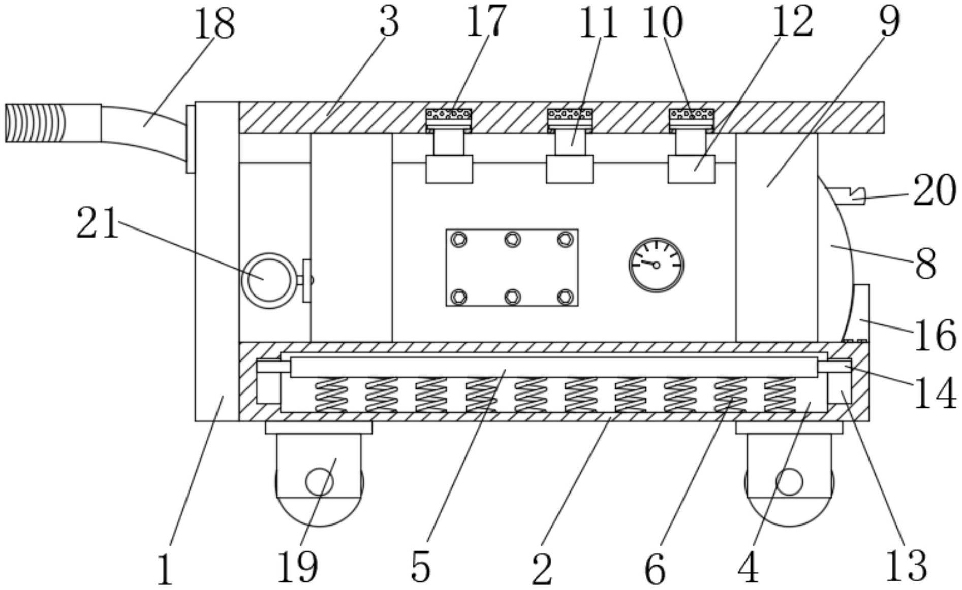 本实用新型涉及气雾剂生产技术领域,且公开了一种气雾剂用运输装置,包括连接板、承重柱和顶板,所述承重柱的数量为两个并前后设置,所述承重柱的左侧与连接板栓接,所述顶板栓接在连接板右侧表面的上方,所述承重柱相对一侧的表面均开设有横向槽,所述横向槽的内壁滑动连接有固定条,所述固定条的底部通过固定扣安装有若干个弹簧;本实用新型具有缓冲功能,能够在运输过程中减少震动对杀虫剂容器的影响,对相关容器进行保护和固定,提升了安全性和防护性,解决了在日常生产中对杀虫剂进行车间转运时,由于相关运输拖车结构简陋,防震和防压措施不到位,易使杀虫剂容器在运输过程中产生震动,存有安全隐患的问题。