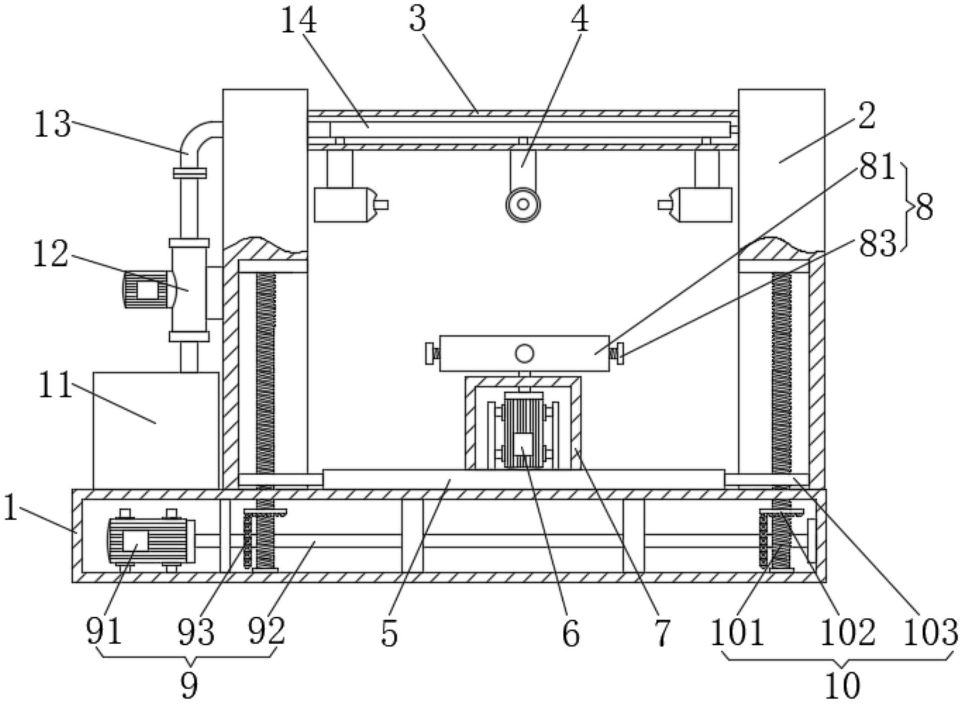 本实用新型涉及气雾剂生产技术领域,且公开了一种气雾剂瓶身表面喷涂装置,包括底座、竖向支架、环形支架和喷嘴,所述竖向支架的数量为两个并分别栓接在底座顶部的左右两侧,所述环形支架的左右两侧分别与竖向支架相对一侧的表面栓接,所述喷嘴安装在环形支架的底部,所述底座顶部的上方且位于两个竖向支架之间设置有升降台;本实用新型可进行多角度同步喷涂,且能对瓶身进行有效固定和转动调节,使得喷涂范围更广,且喷涂均匀,解决了在使用单个喷枪对钢瓶的表面进行喷涂时,效率较为低下,而且通过移动喷枪进行喷涂容易造成瓶身表面喷涂不均匀,影响其表面美观的问题,提高了该装置的实用性。