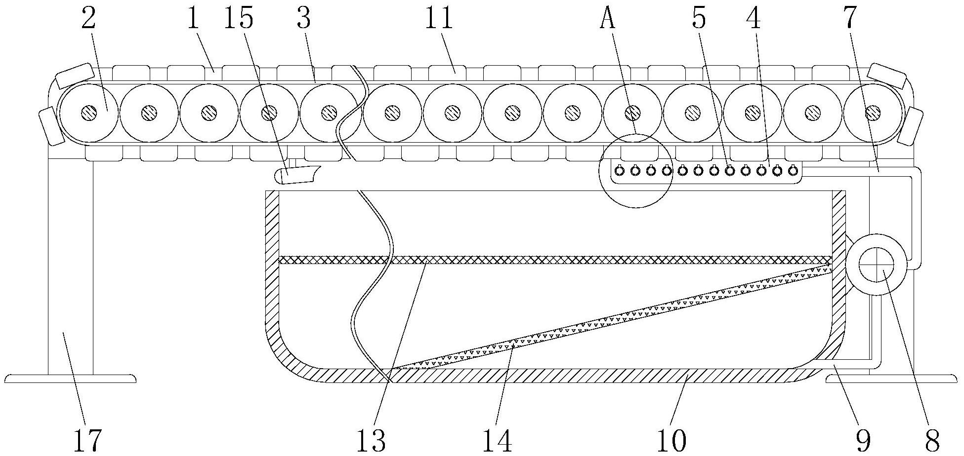 本实用新型涉及灌装技术领域,且公开了一种气雾剂灌装用输送装置,包括输送架、输送辊和输送带,所述输送辊的两端与输送架内部的孔洞转动连接,所述输送辊的表面与输送带的内侧设置,所述输送架底部右侧的前端和后端均栓接有连通管件,所述连通管件的内侧之间连通有清洗管,所述清洗管的顶部连通有加压喷嘴,所述连通管件的右侧连通有进水管,所述进水管远离连通管件的一端连通有水泵,所述水泵的进水端连通有抽水管;本实用新型具备既能对传送带进行清洗,也能减少转运步骤的优点,解决了目前的输送装置在灌装过程中容易被灌装的液体污染,而且传送带没有将待灌装瓶限位的部件,需要转运到灌装机专用输送带上的问题。