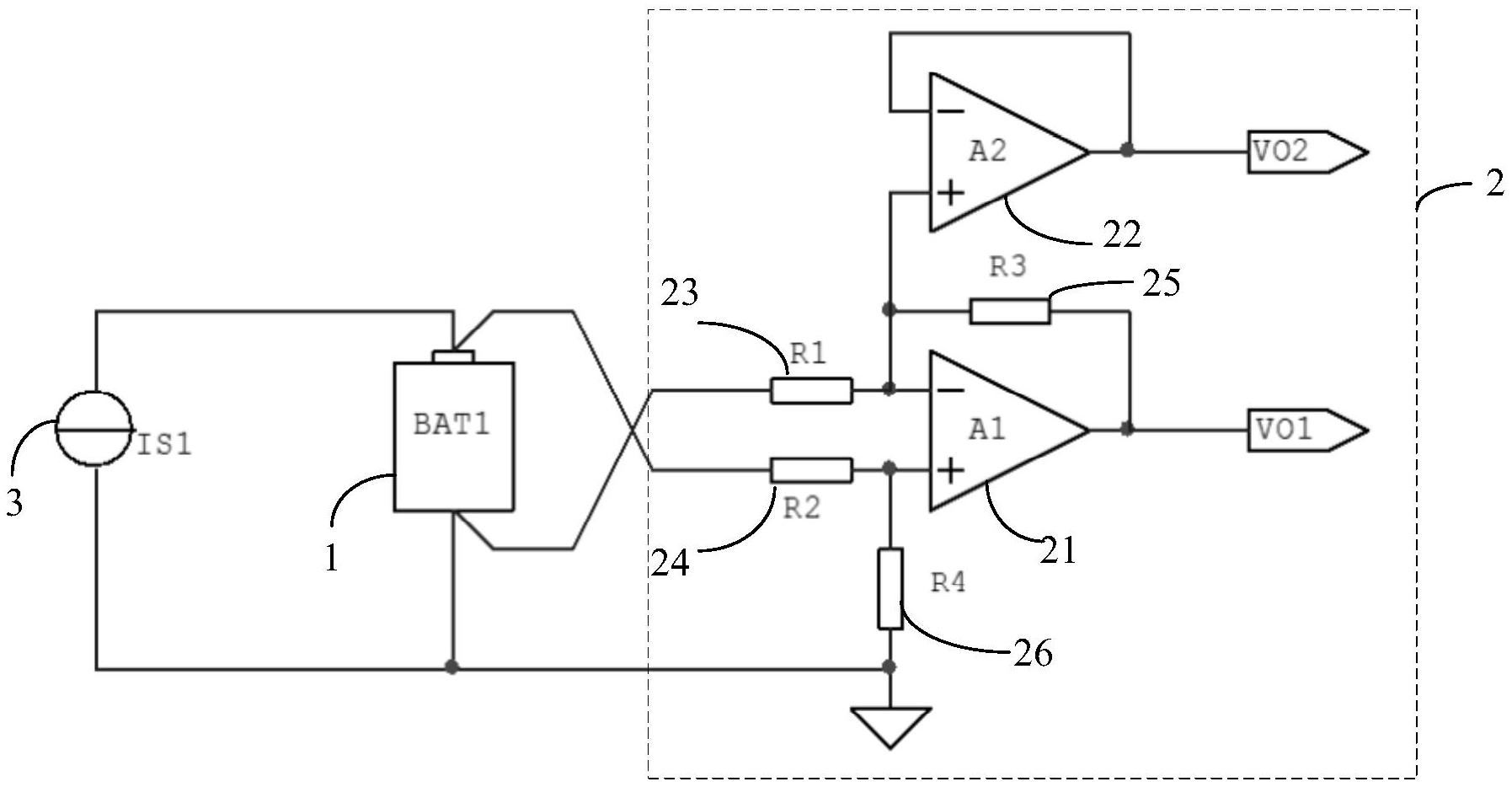 本实用新型实施例提供了一种电池的检测系统。电池的检测系统包括电池和差分放大电路;差分放大电路包括第一差分放大器和第二差分放大器,电池的正极电连接在第一差分放大器的正相输入端中,电池的负极电连接在第二差分放大器的反相输入端中,第二差分放大器的正相输入端和第一差分放大器的反相输入端电连接;在电池的负极和第一差分放大器的反相输入端的连接电路发生断路的情况下,第一差分放大器的输出端的电压等于第二差分放大器的输出端的电压;在电池的负极和第一差分放大器的反相输入端正常电连接的情况下,第一差分放大器的输出端的电压大于第二差分放大器的输出端的电压。这样,避免电池出现过量充电,提升电池在生产检测过程中的安全性。