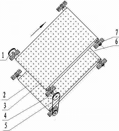 花生摘果机用多道分选装置。本实用新型的技术方案是以如下方式完成的,它包括有与花生摘果机配合的凸凹花纹输送带,凸凹花纹输送带呈35-45°向上倾斜安装在摘果机喂料口背面的机架上,在凹凸花纹输送带的下面留出过料通道向喂料口方向错位突出安装有至少一层再分选凸凹花纹输送带,在各层输送带下传动辊的一端分别安装有用皮带联动的带轮,在一个输送带的底部传动辊另一端安装有一个与摘果机传动轴相连的主动轮,在各层输送带的传动辊轴两端分别设有与机架配合的连接轴壳。本实用新型通过至少两次分选,能有效提高分选效率和质量,防止堵塞摘果机筛面的效果。