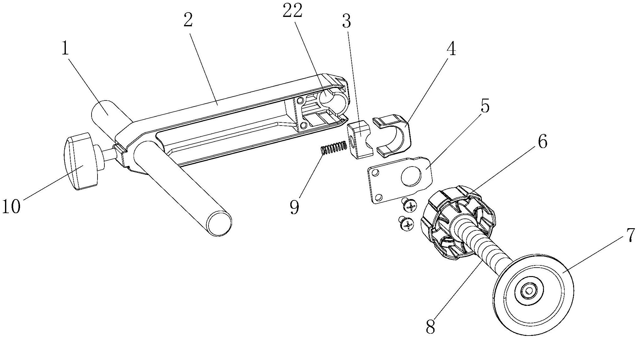 本实用新型公开了属于夹具技术领域的一种快速夹紧器,包括连杆,连杆的一端设有固定杆,连杆的另一端设有丝杆,丝杆的下端设有压盘,连杆与丝杆的连接处设有通孔,连杆的内部设有与丝杆相对应的锁紧螺母,锁紧螺母上设有与丝杆相啮合的螺纹,锁紧螺母远离丝杆的一侧设有弹簧,锁紧螺母的另一侧设有按钮,按钮与连杆滑动连接。本实用新型的锁紧螺母以及按钮水平设置在连杆内,在连杆内进行水平的移动,相比于现有技术中的夹紧器来说,移动的行程更短,从而操作的更加方便;本实用新型结构简单,从而有效的降低了生产成本,操作更加的方便,且使用过程中的故障率低。