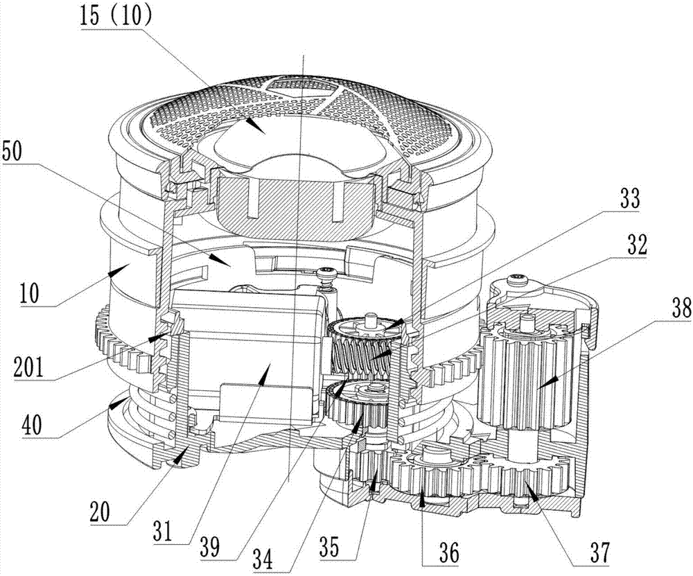 本实用新型公开了一种扬声器,包括扬声器本体、驱动底座和驱动组件;扬声器本体包括主壳体,主壳体内设有一壳体空腔;驱动底座内设有一底座空腔,壳体空腔与底座空腔组合形成容置腔;驱动组件包括驱动电机、主动齿轮、过渡齿轮、第一从动齿轮和第二从动齿轮;驱动电机和主动齿轮均位于容置腔内;主壳体上设有若干个环绕主壳体外圆面设置的主壳体从动齿,若干个主壳体从动齿形成主壳体从动齿轮,主壳体从动齿轮与第二从动齿轮啮合连接;主壳体内壁设有螺旋沟槽,驱动底座上设有螺旋凸条;通过使用丝杆螺母原理的传动方式控制扬声器的上升或下降,不仅扩充了扬声器的功能、增强了扬声器的科技感,还提高了扬声器升降的可控性和准确度。